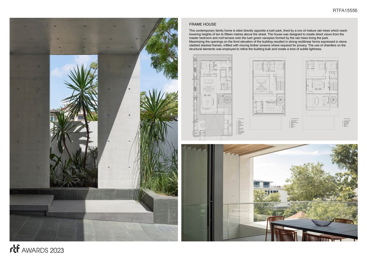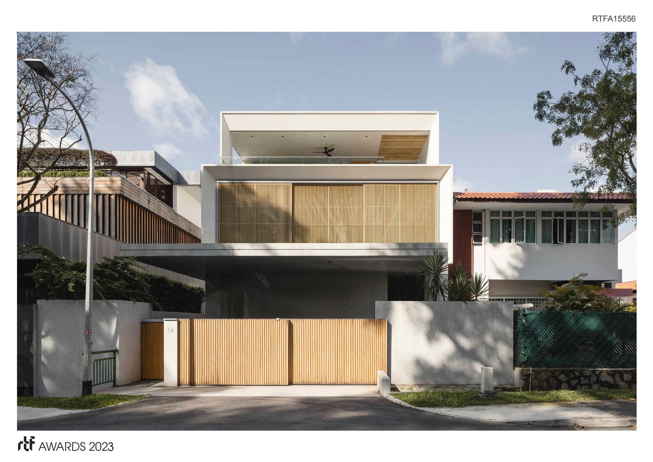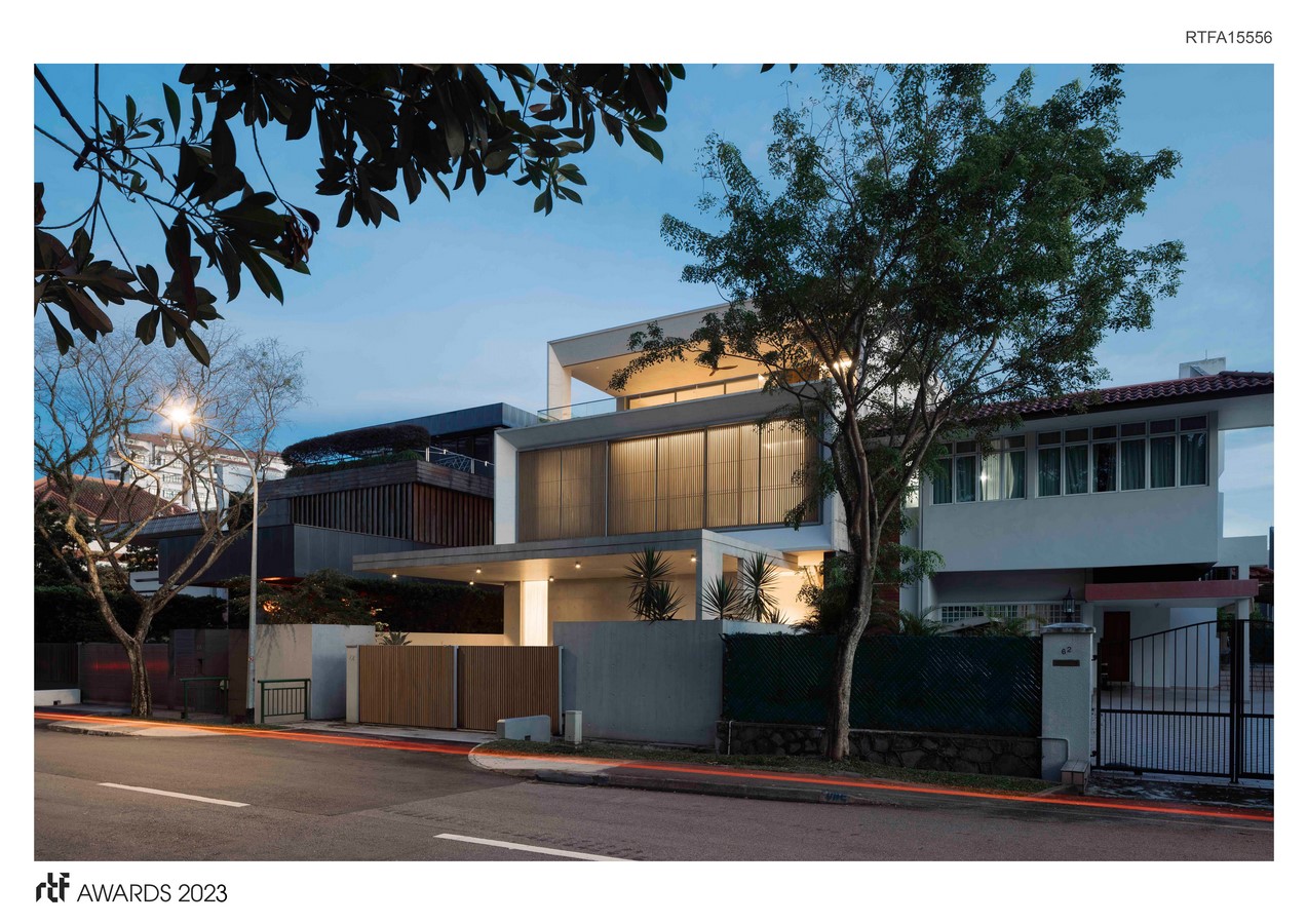 This contemporary family home is sited directly opposite a lush park containing a children’s playground, lined by a row of mature rain trees which reach towering heights of ten to fifteen metres above the street. The house was designed to create direct views from the master bedroom and roof terrace onto the lush green canopies formed by the rain trees lining the park.