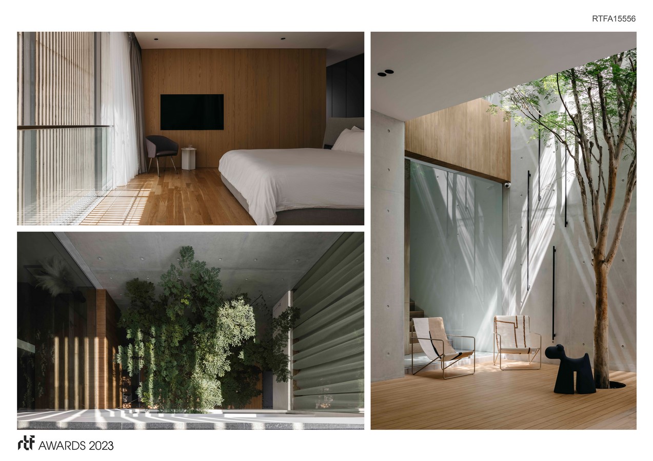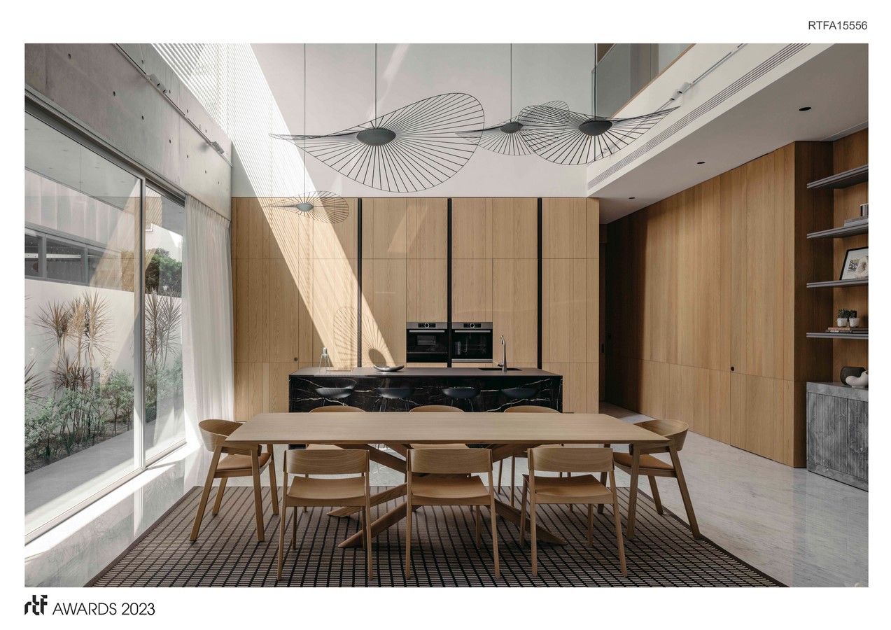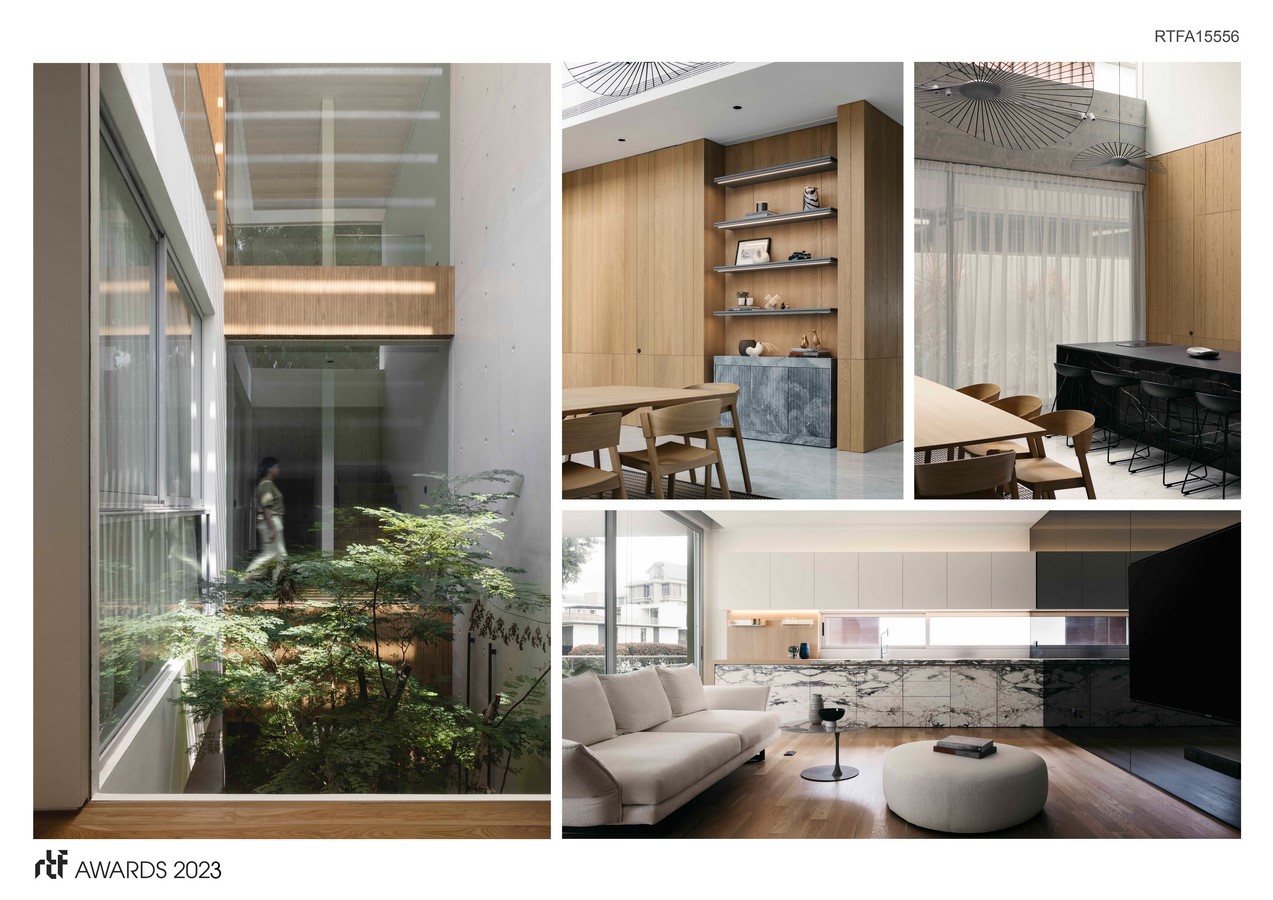 Designed to rely fully on natural lighting in the day, The courtyard draws in daylight, breeze and ventilation deep within the house, and incorporates nature into the living environment, focused on a single Caesalpinia tree. During the day, the breeze rippling through the tree branches creates shifting shadows on the courtyard walls.