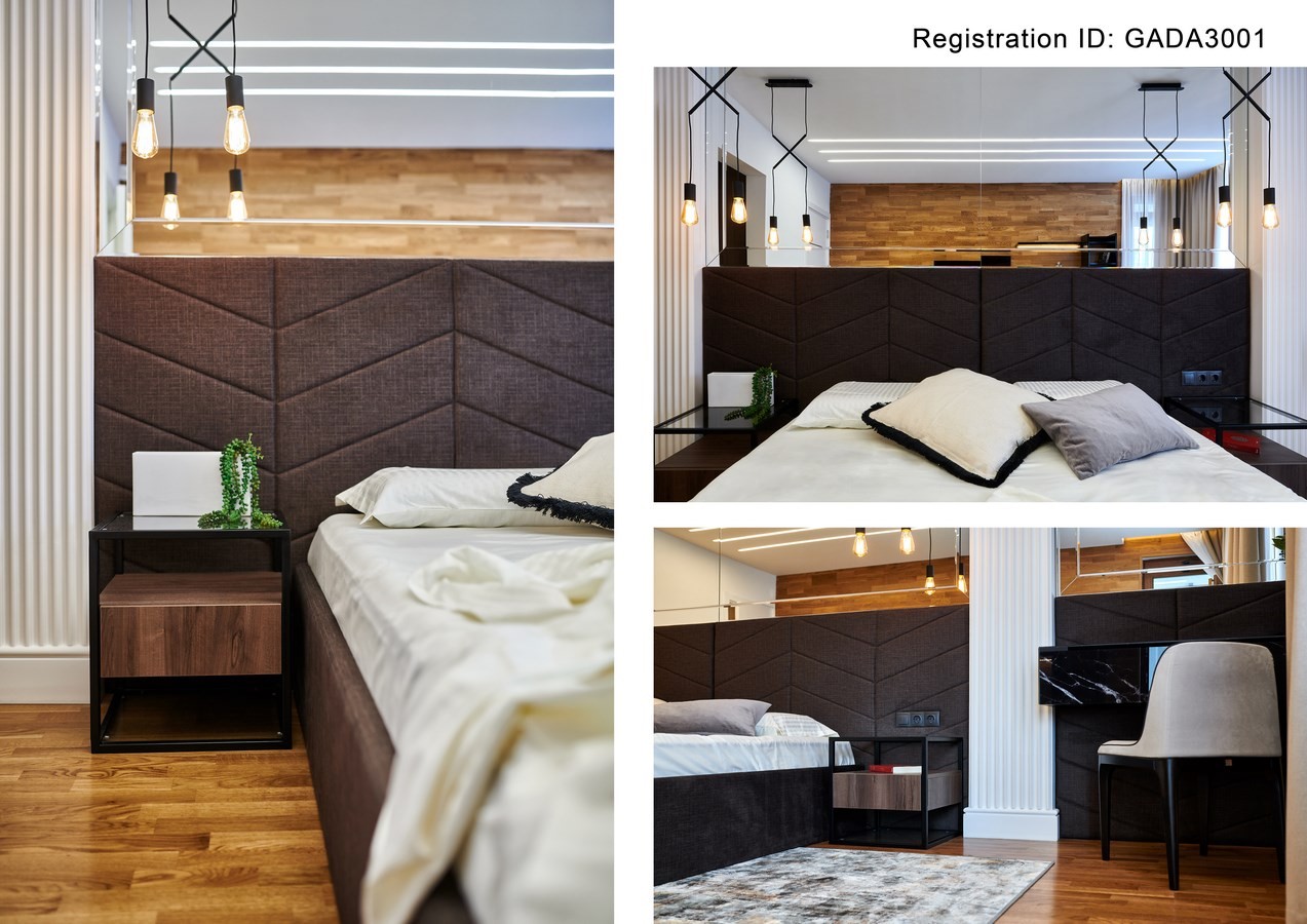 In the corridor is a mirror wall that optically enlarges the space. The majority of lining the corridor are made with granite marble vision to bring an extra element of elegance. In the whole apartment is laid three-layer parquet. The same parquet is used for lining one of the walls in the large bedroom. It has a spacious walk-in closet and a facade mirror is mounted on the wall behind the bed. On both sides of the bed, as well as on the mirror wall in the corridor, there are decorative columns that give an elegant end to the design.