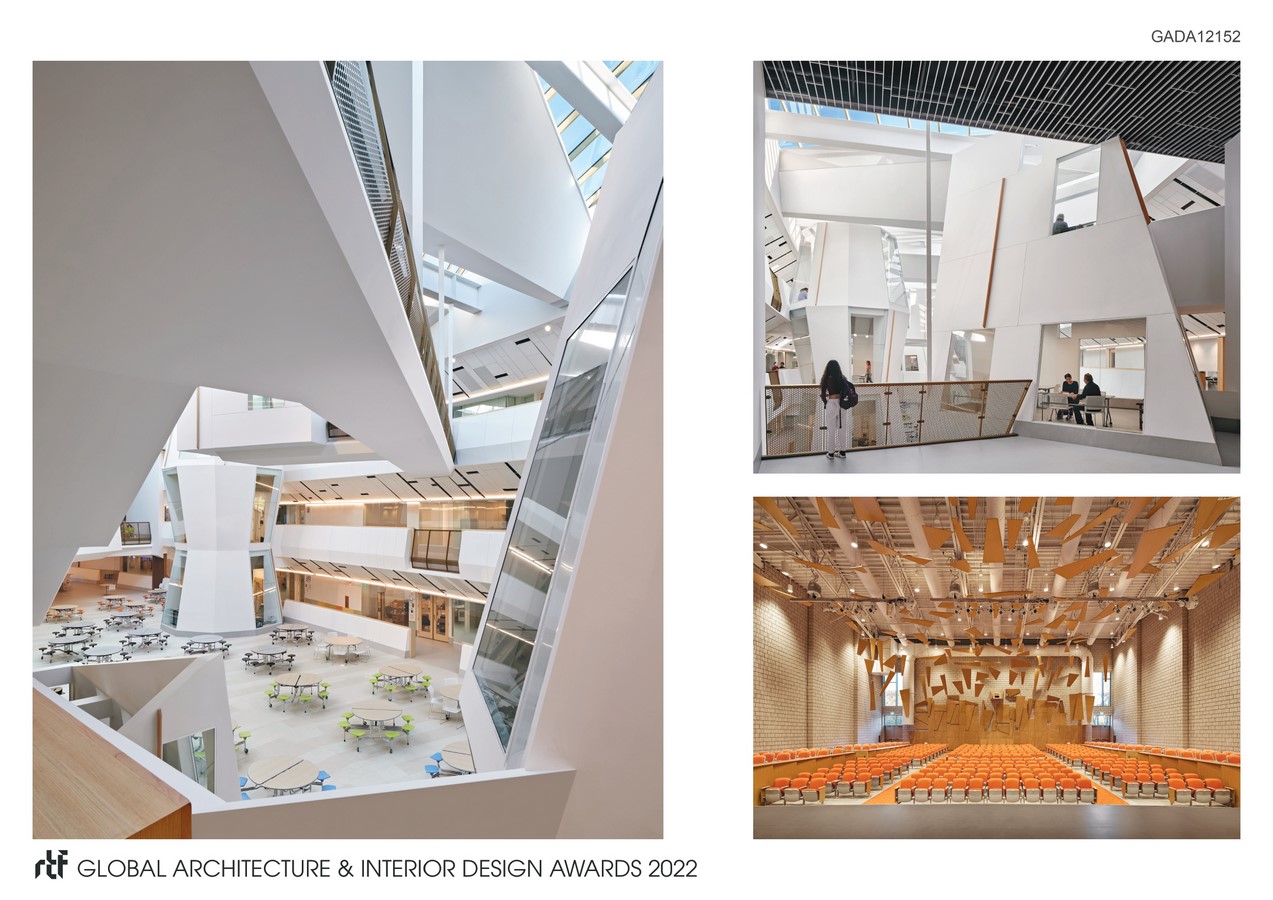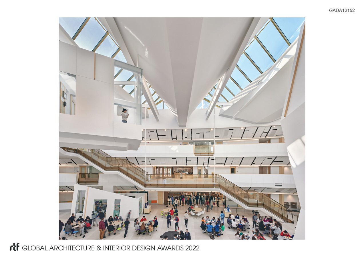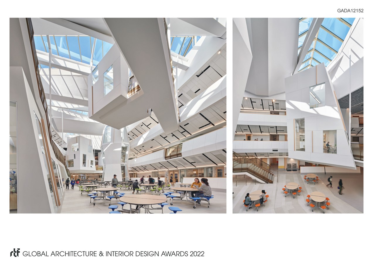 The Folded Hands design offers a new three-story construction with a learning commons/cafeteria at the core surrounded by collaboration balconies fronting a perimeter of classrooms, an 8,300-square-foot gymnasium, 420-seat auditorium, and full-building air conditioning. Additionally, there is space for instructional areas for Science, Technology, Engineering, Art, and Mathematics (STEAM). No swing space was required during construction, which means a lack of neighborhood interference. There was no need to temporarily move students to an alternative location.