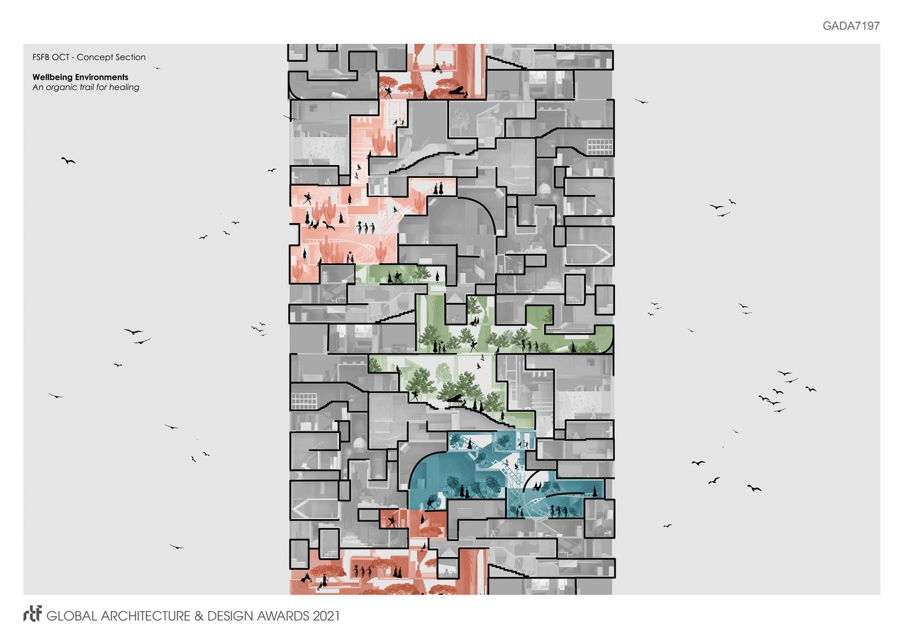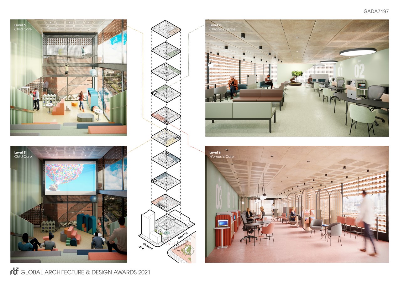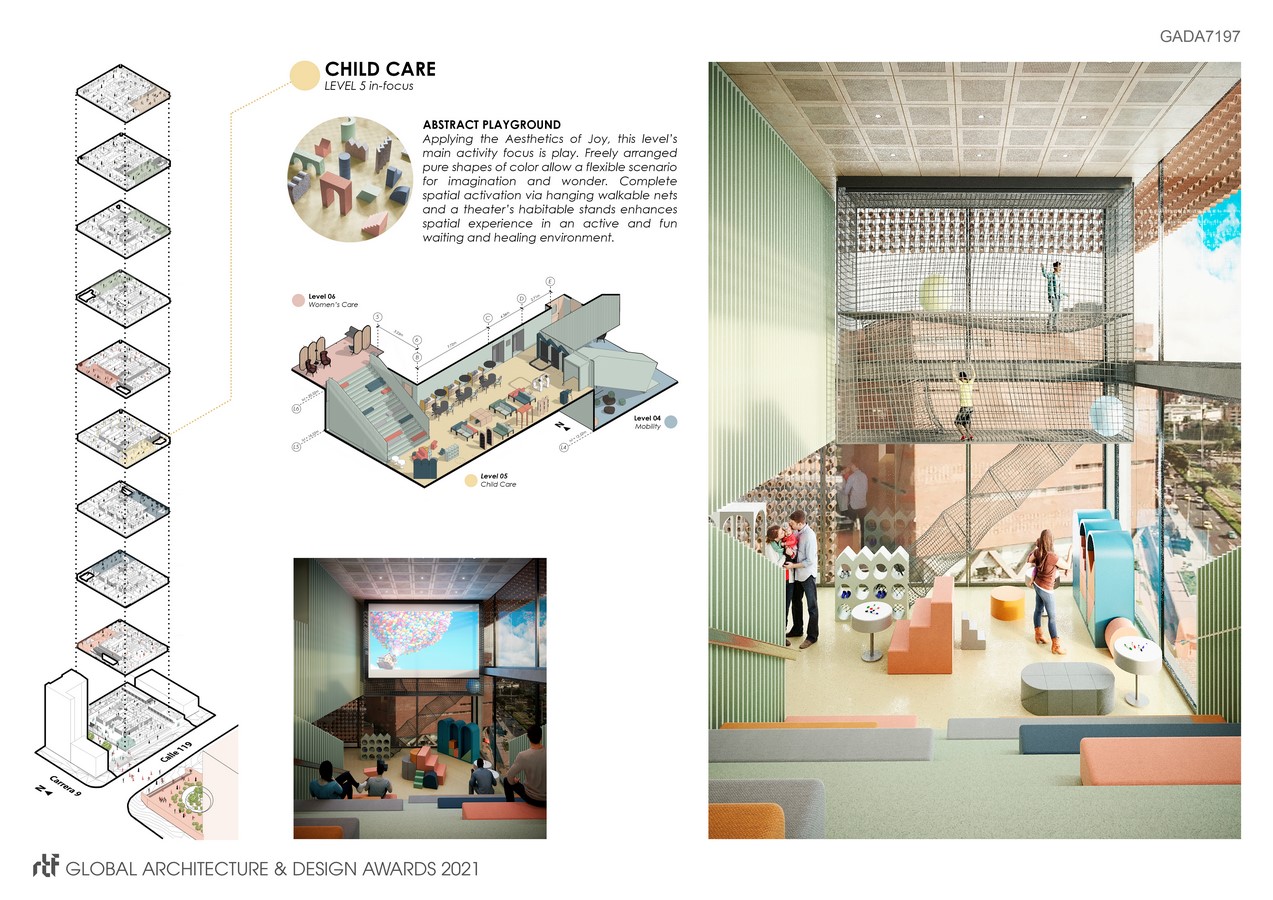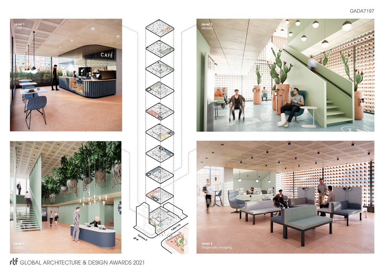 For instance, the chronic gastroenterology level is designed with a healthy food garden and store, the child care level is defined by its abstract playground, and the mobility levels’ patients can make use of an AI-assisted orthopedic walking track while waiting. Altogether, these attributes are balanced and exploited to configure uniquely appealing atmospheres within the constraints of the project’s aesthetic continuity and experience.