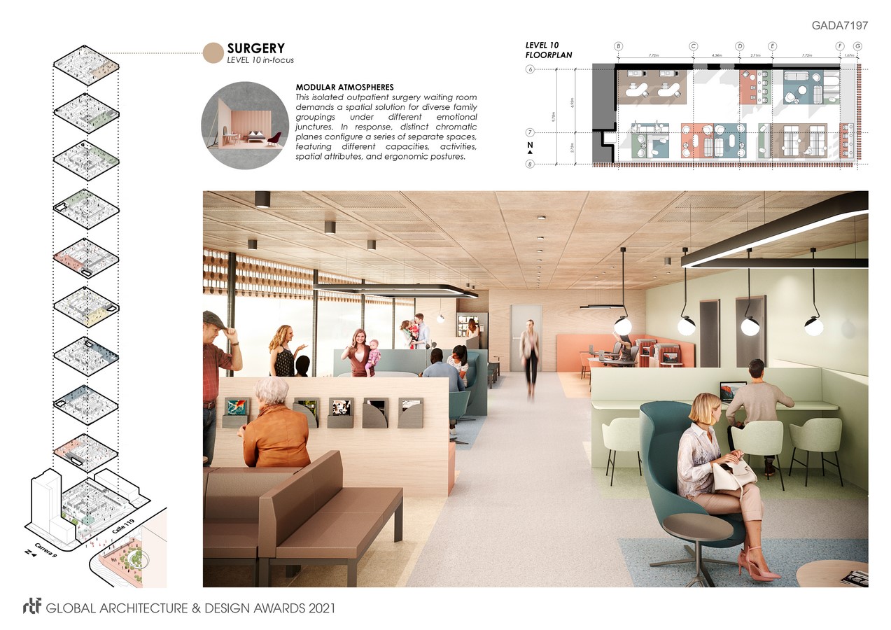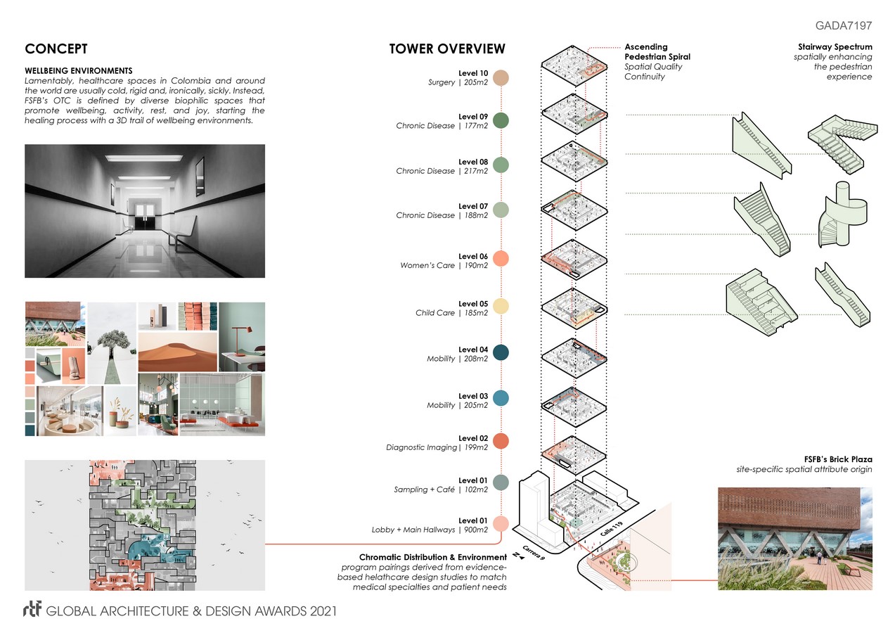 Fundación Santa Fe Outpatient Care Tower (FSFB OCT) is an interior design project located across a semi-pedestrianized street from Santa Fe hospital’s iconic brick plaza and gardens. A receiving courtyard and an array of green stairways interconnect the public spaces of the tower in an ascending interior pedestrian spiral that elevates throughout its 10 levels. Drawing from the brick plaza’s spatial qualities, the program’s innate demands, a year-long in-depth local research, and scientific evidenced-based design studies, different health-promoting spatial attributes were matched to each medical specialty and tower level. As a result, the project generates a site-specific, appealing and heterogeneous pathway of wellbeing environments.
