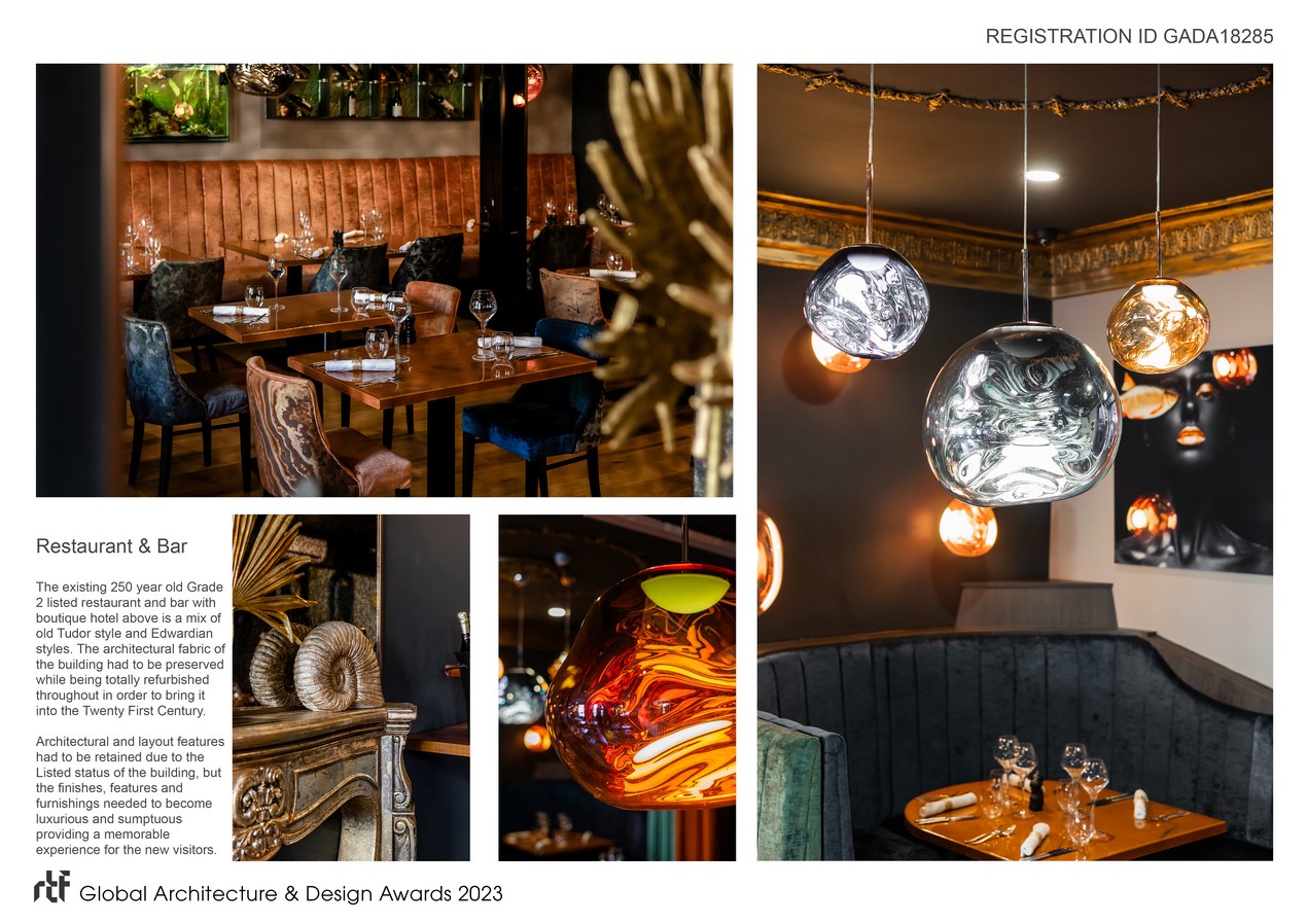 The existing 250 year old Grade 2 listed restaurant and bar with boutique hotel above is a combination of old Tudor style and Edwardian styles.