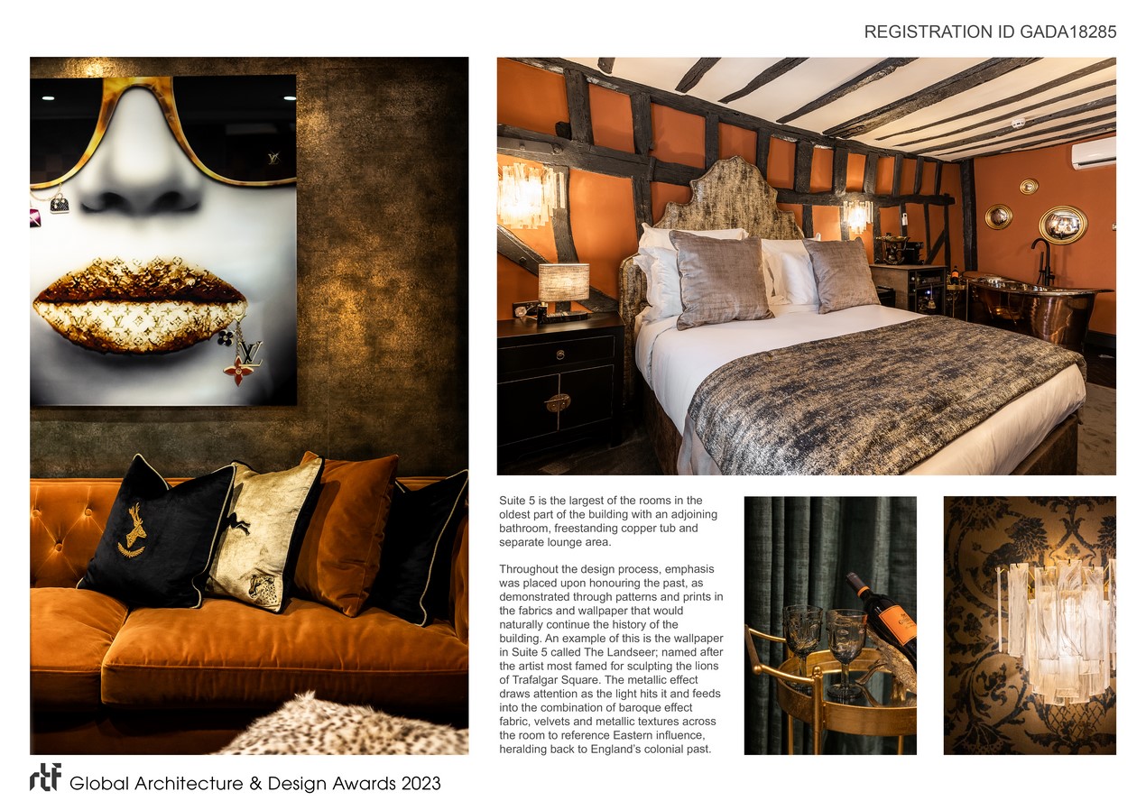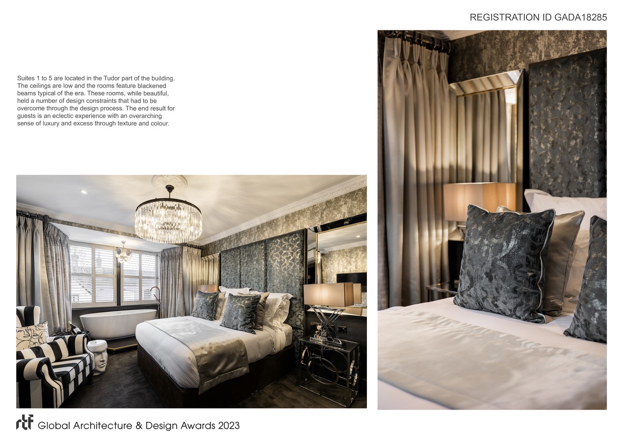 The client wanted an alluring and sensual design, juxtaposing the old and new with emphasis on touch. For example: the fabrics and finishes needed to be tactile, and also the two building styles within the same floor needed to become cohesive and link together in a flow of spaces. This cohesion of design needed to run through not just the 9 hotel suites but also the open plan restaurant and bar.
