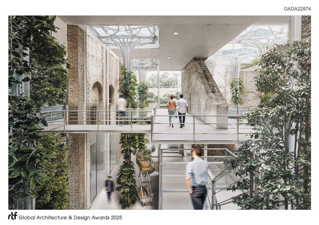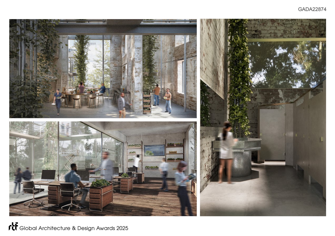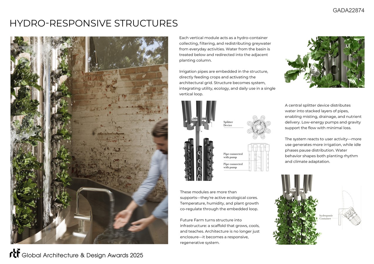 At its core is a closed-loop system where water from everyday activities becomes agricultural input. Tree-like hydroponic modules collect rainwater, filter greywater from sinks and restrooms, and circulate it through vertical planting beds. These structures double as load-bearing columns and ecological vessels—visible, interactive, and embedded throughout the building. They regulate humidity, deliver irrigation, and shape the building’s spatial rhythm.