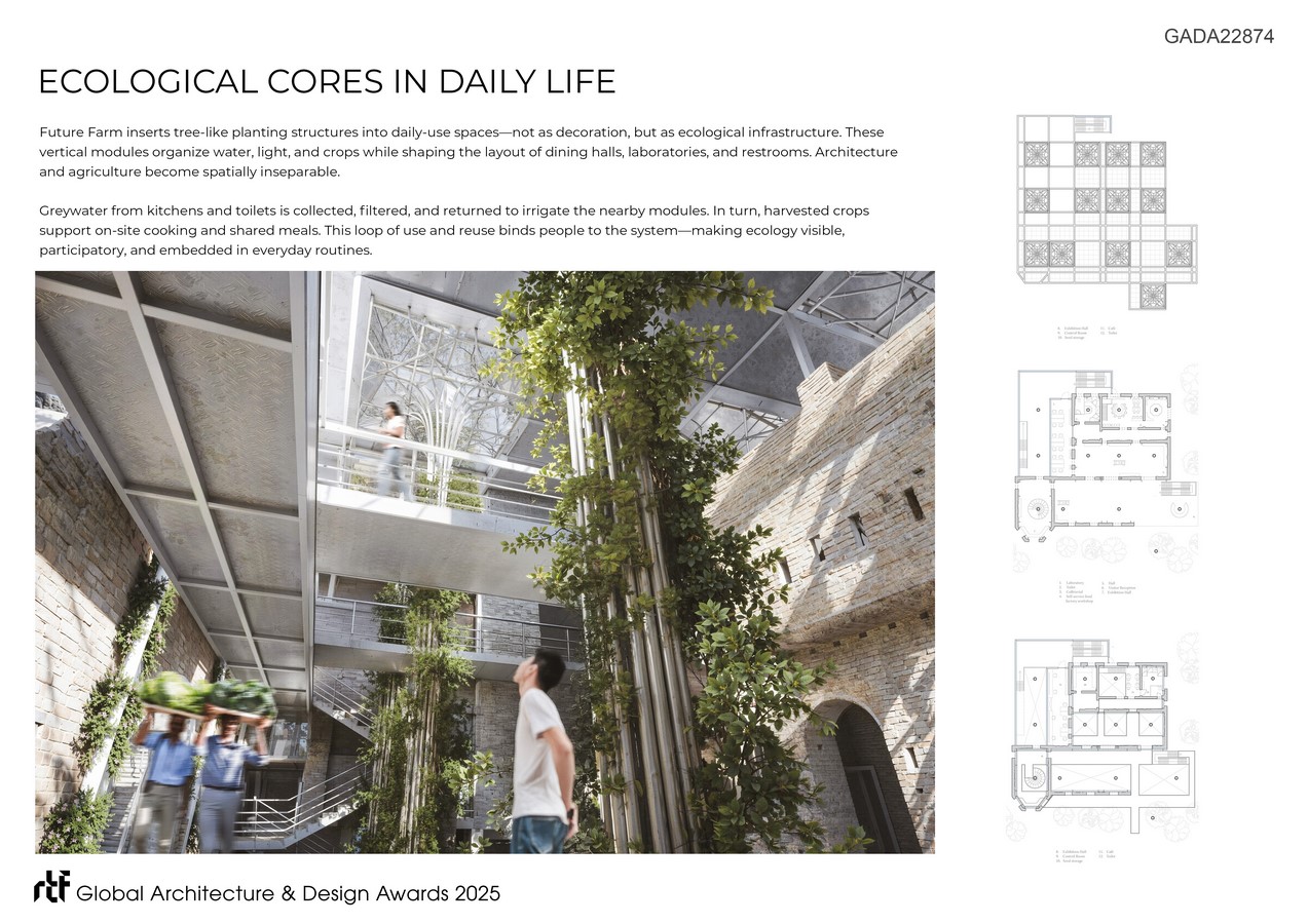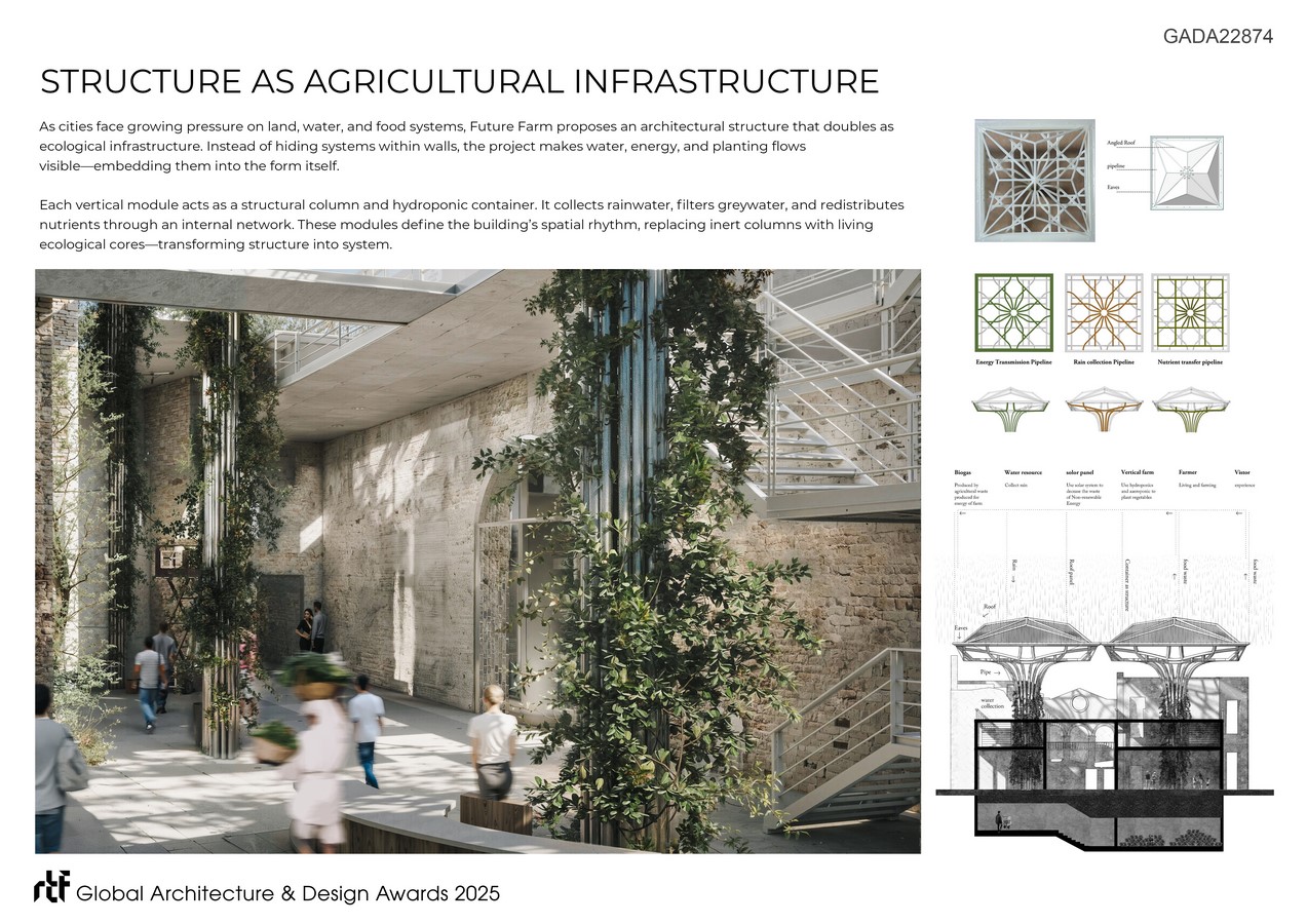 Future Farm was conceived and developed by Qing Duan through an independent spatial research practice. The project synthesizes environmental systems, urban agriculture, and social interaction into a holistic, regenerative framework.