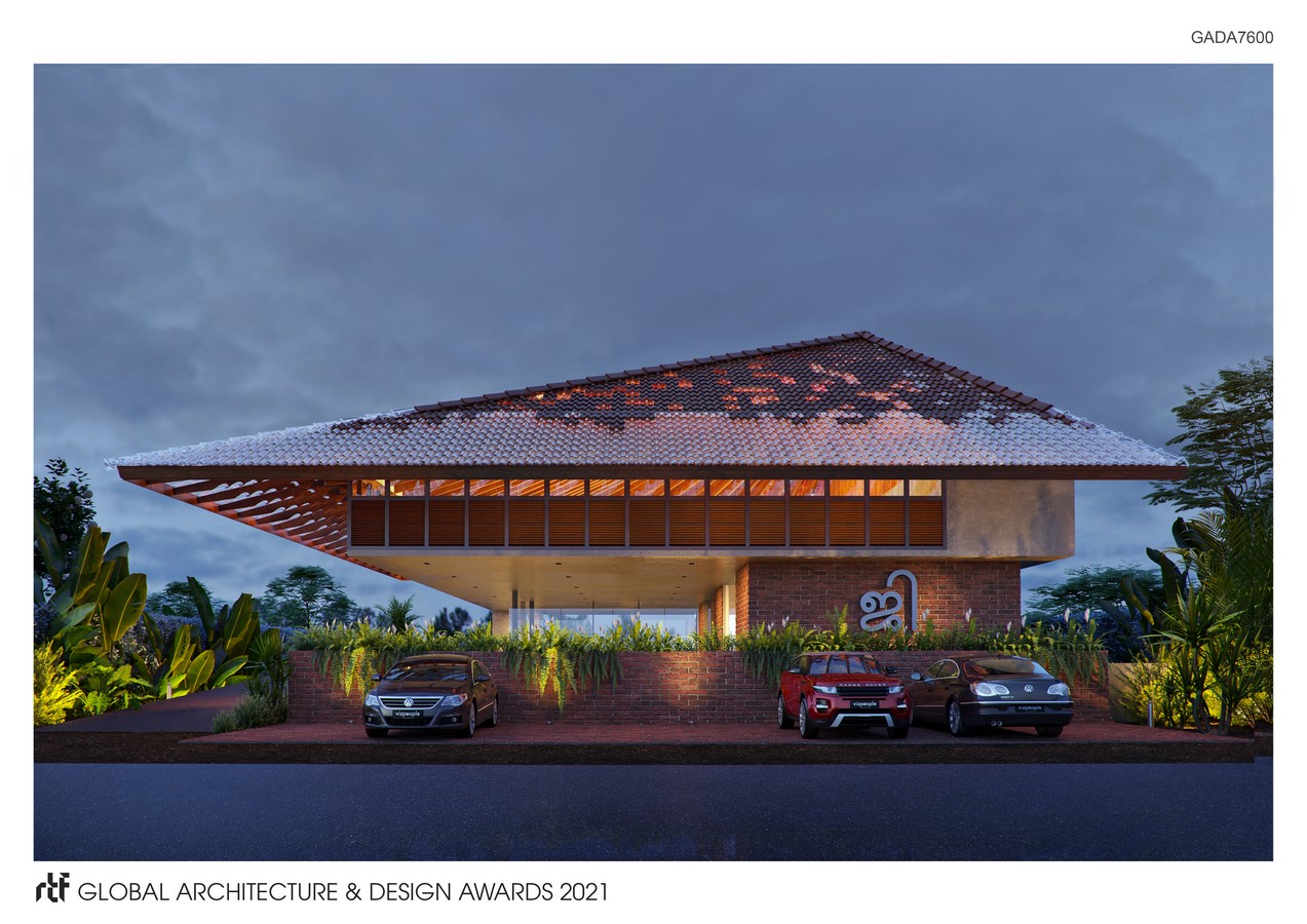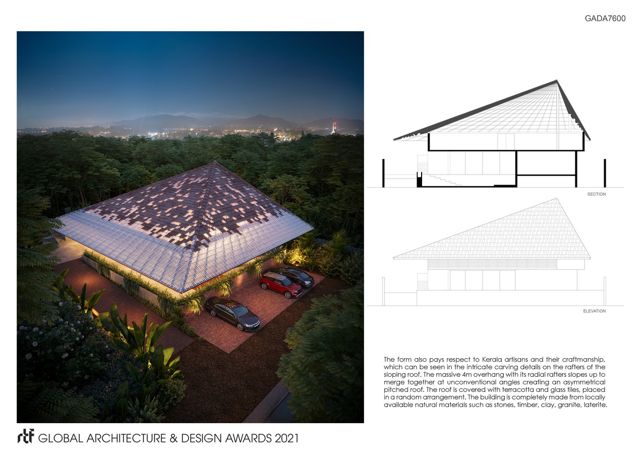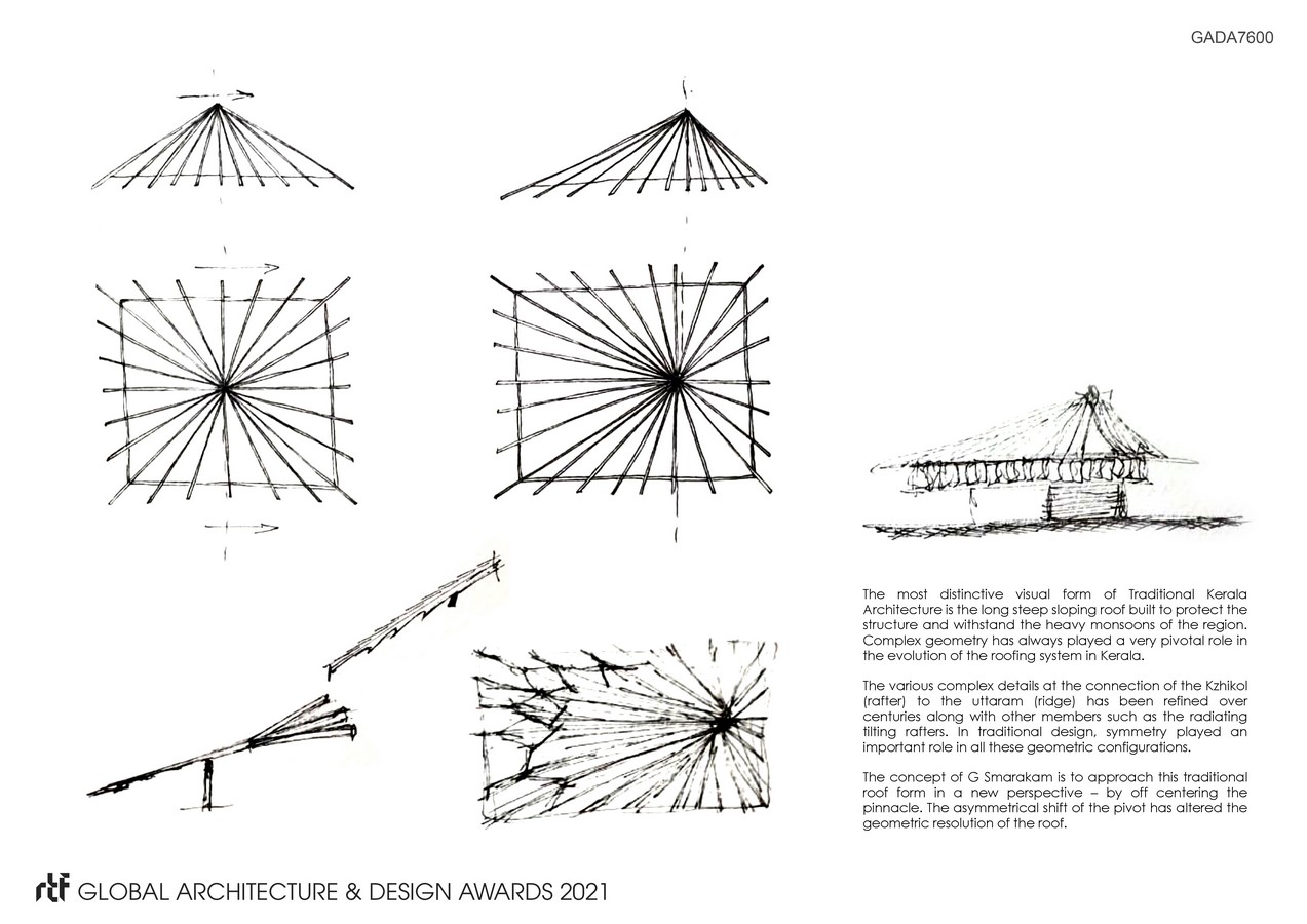 The concept of G Smarakam is to approach this traditional roof form in a new perspective – by off centering the pinnacle. The asymmetrical shift of the pivot has altered the geometric resolution of the roof. The form also pays respect to Kerala artisans and their craftmanship, which can be seen in the intricate carving details on the rafters of the sloping roof. The massive 4m overhang with its radial rafters slopes up to merge together at unconventional angles creating an asymmetrical pitched roof. The roof is covered with terracotta and glass tiles, placed in a random arrangement. The building is completely made from locally available natural materials such as stones, timber, clay, granite, laterite.