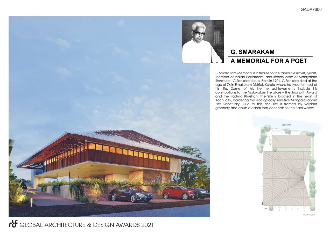 G Smarakam Memorial is a tribute to the famous essayist, lyricist, Member of Indian Parliament, and literary critic of Malayalam literature – G Sankara Kurup. Born in 1901, G Sankara died at the age of 76 in Ernakulam District, Kerala where he lived for most of his life. Some of his lifetime achievements include his contributions to the Malayalam literature – the Jnanpith Award and the Padma Bhushan. The Site is located in the heart of Kochi city, bordering the ecologically sensitive Mangalavanam Bird Sanctuary. Due to this, the site is framed by verdant greenery and abuts a canal that connects to the Backwaters.
