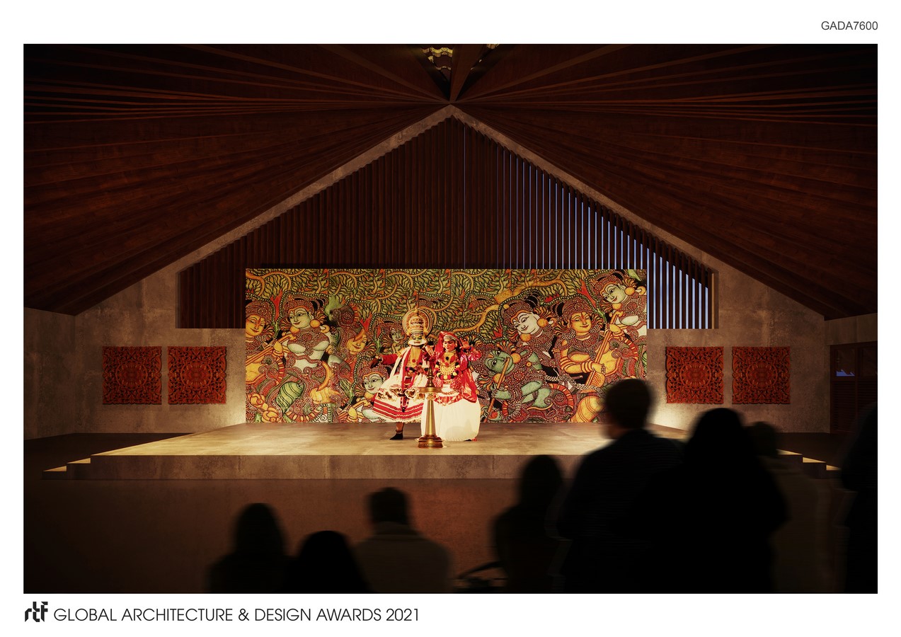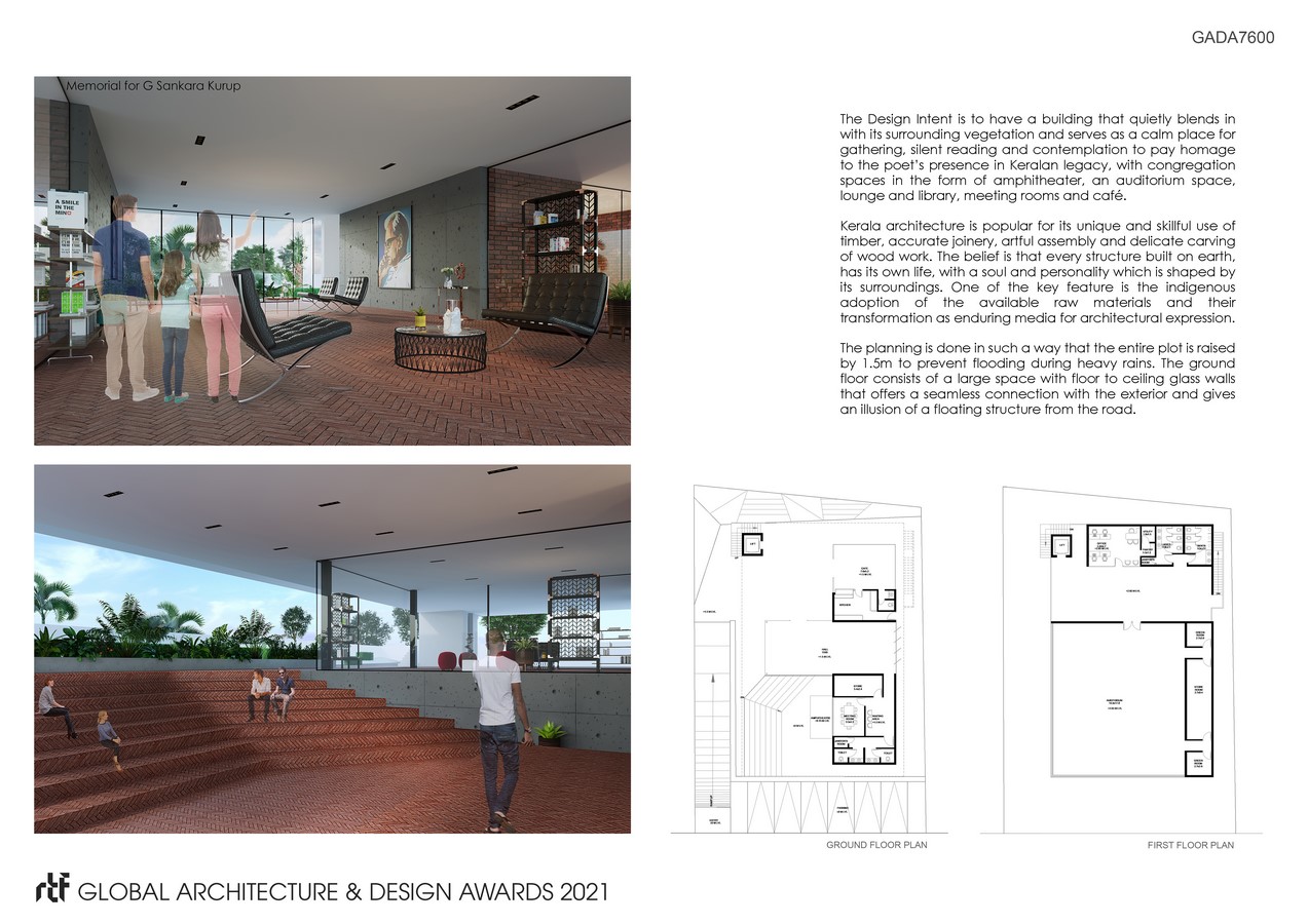 The Design Intent is to have a building that quietly blends in with its surrounding vegetation and serves as a calm place for gathering, silent reading and contemplation to pay homage to the poet’s presence in Keralan legacy, with congregation spaces in the form of amphitheater, an auditorium space, lounge and library, meeting rooms and café.