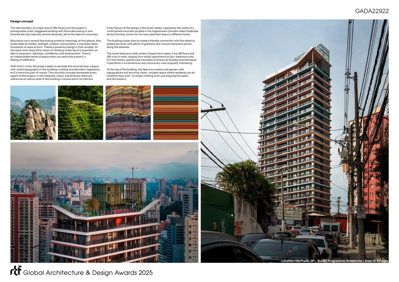 The site’s location (in a high area of São Paulo) and the project’s prerequisites (a tall, staggered building with floors decreasing in size towards the top) naturally, almost obviously, led to the idea of a mountain. Mountains carry several fascinating symbolic meanings: at first glance, they evoke ideas of solidity, strength, wisdom, and ancestry: a mountain takes thousands of years to form. There’s a powerful energy in that concept. At the same time, there’s the notion of climbing to the top of a mountain: an idea of ascension, lightness, confidence, and achievement. There’s an indescribable sense of peace when you reach the summit, a feeling of fulfillment.