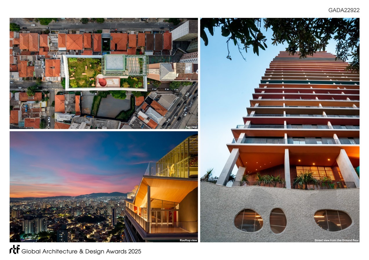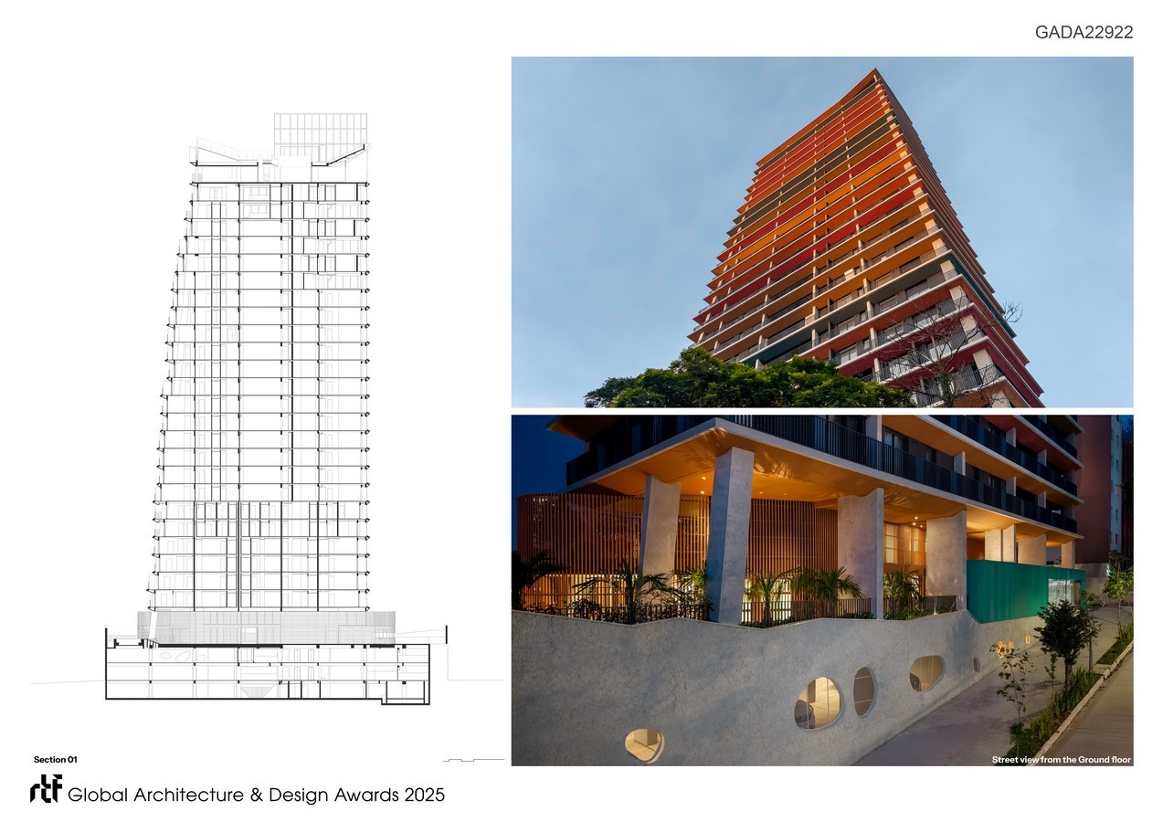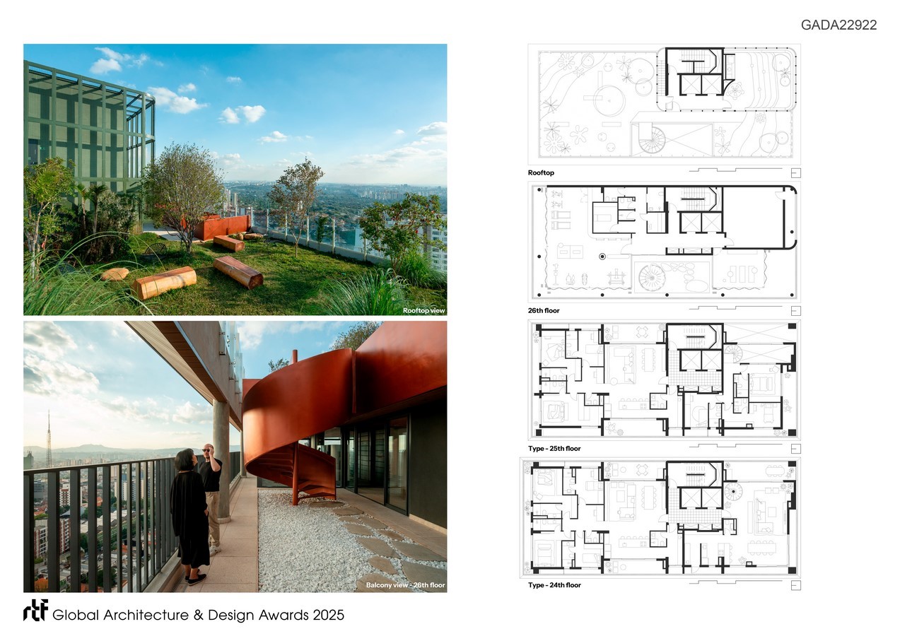 The building’s base aims to create a friendly connection with the street at pedestrian level, with plenty of greenery and various interaction points along the sidewalk. The tower features a wide variety of apartment types: it has 28 floors and 126 units in total, ranging from studio apartments to four-bedroom units. For that reason, special care was taken to ensure all facades received equal importance in a harmonious way, since every view is equally interesting.