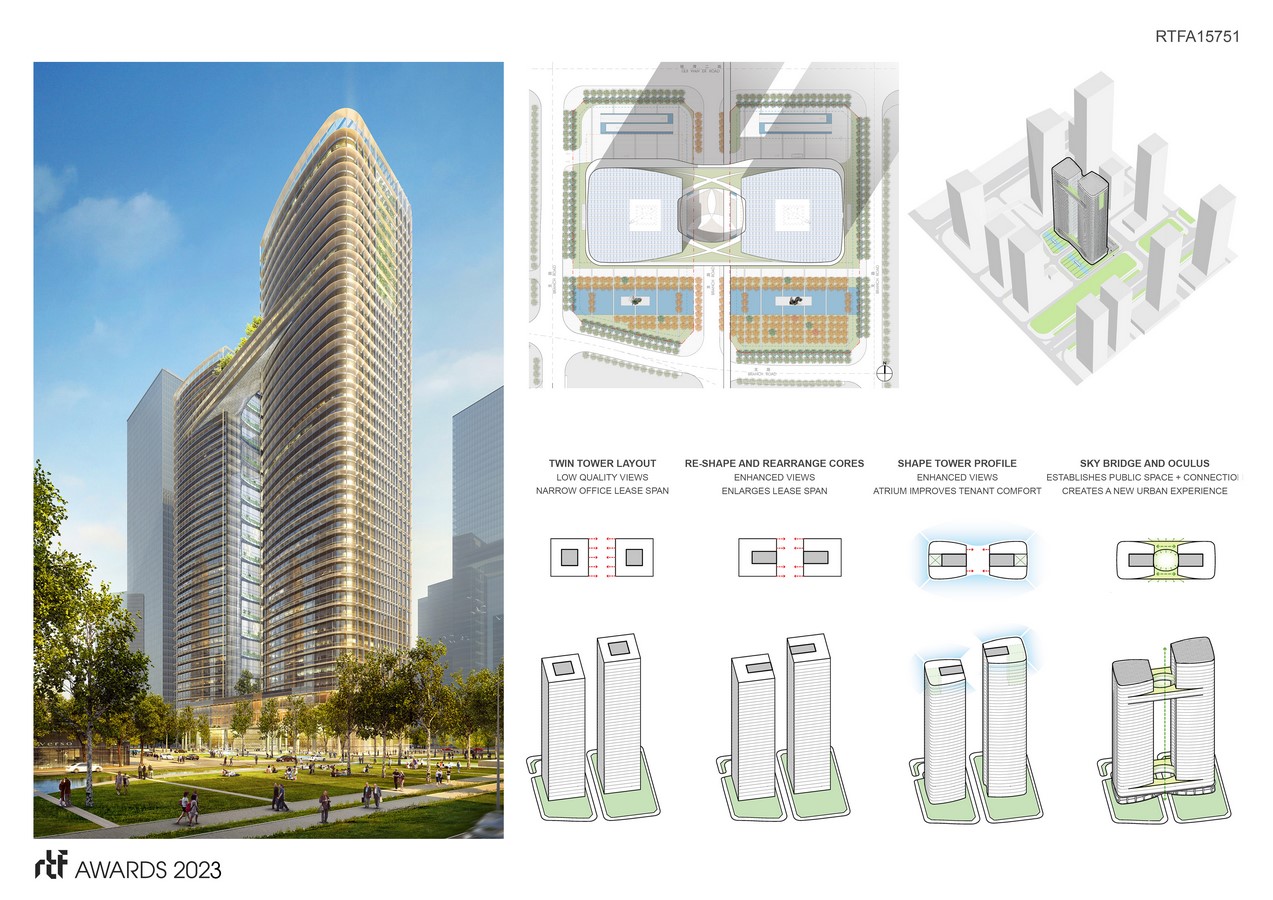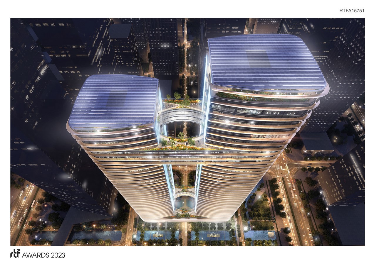 Designed for the fast-developing Qianhai District in Shenzhen, China’s south financial and technology hub, Golden Bridge Twin Towers is envisioned technologically innovative, interactive, resilient, and sustainable skyscraper. The site is adjacent to Qianhai Bay and the district park, drawing design inspiration from its connection to nature. At 200 m tall and 180 m tall, the towers have elongated masses with smooth corners and plan, sloping inward to optimize the solar and wind performance, minimize the impact of the dense urban environment, and maximize the views to the bay and park.