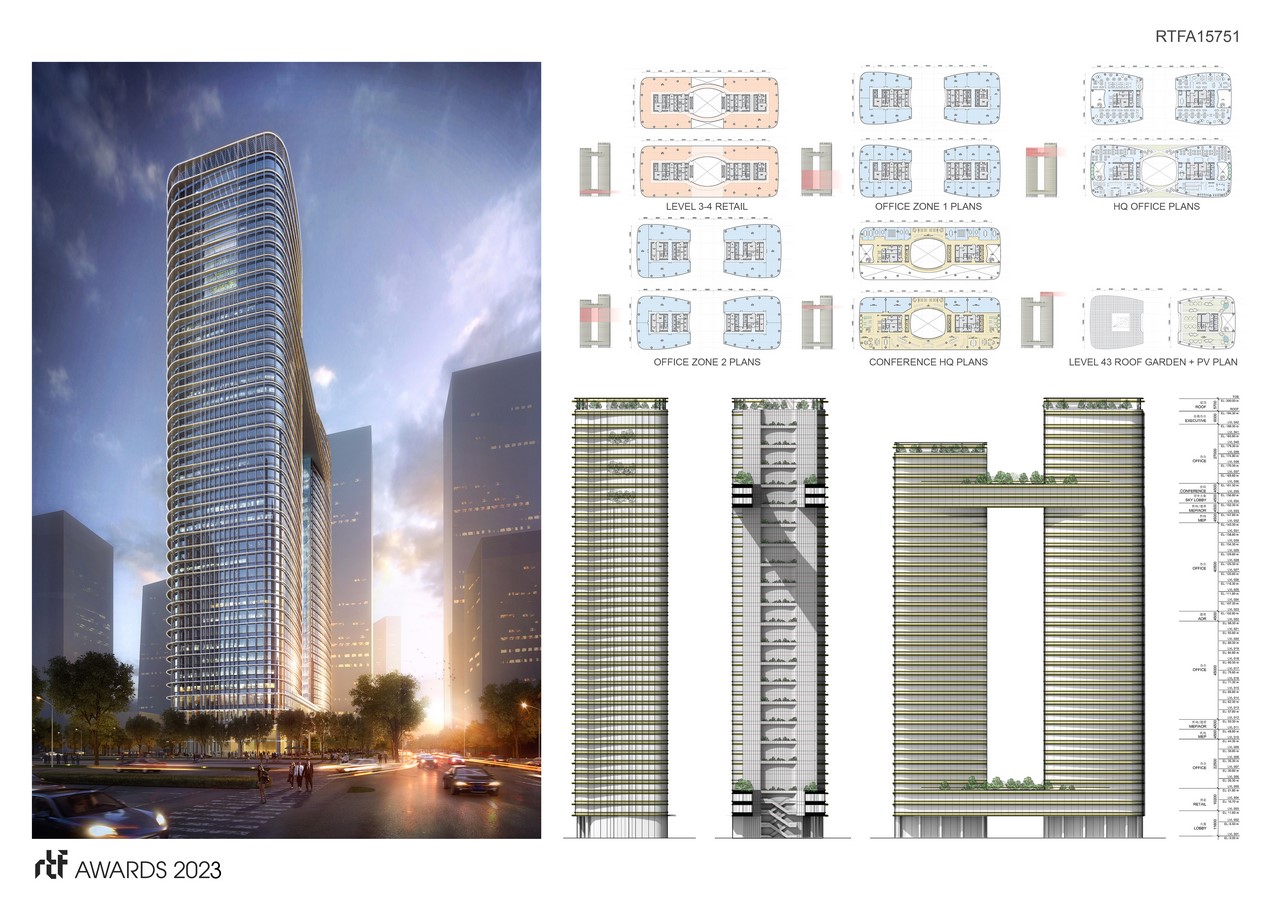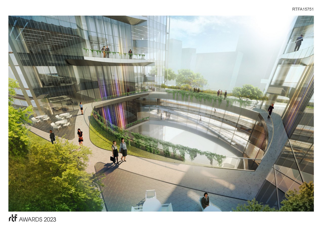 Orientated around the central opening in the sky bridges, an exciting central public space establishes a venue for people to connect, meet, and celebrate events, with access to connections internally to multiple floors and externally to roof terrace gardens. Retail spaces are provided in the lower skybridge, while the upper bridges programing is flexible and can offer exhibition, dining, and socialization, as well as conference space and training facilities.