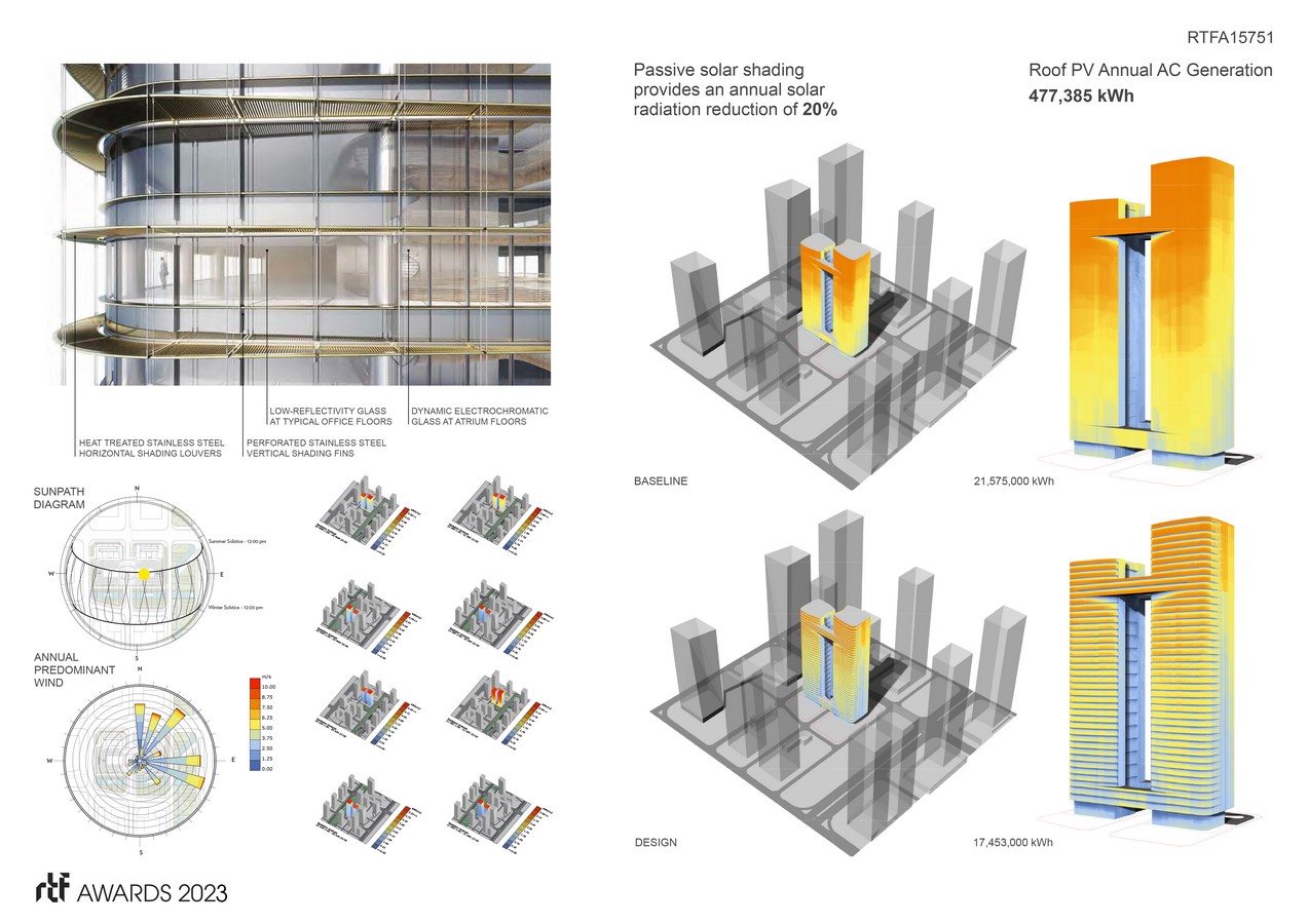 The building’s façade is carefully designed to optimize the solar and ventilation performance. Sunshades are deep and horizontal on the south to control the shading from high angle sun. The sunshades move gently around the building corners to reduce the depth in horizontal direction and increase the vertical direction to filter the low angle sun from morning and afternoon. A special glazing with dual photochromic and electrochromic property will be used to control the atrium solar condition with the maximized view out. Horizontal ventilated mullions will provide the interior users convenient control of natural ventilation in the appropriate weather.