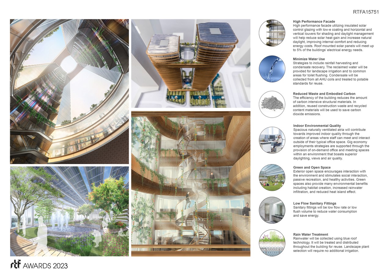 Golden Bridge Twin Towers uses multiple strategies for increased sustainability including high-performance façade with solar heat gain reduction, roof PV renewable energy generation, 60% water reduction, waste, and embodied carbon reduction, improved indoor quality with view, daylighting, and natural ventilation, on demand interactive office intelligent control, as well as access to the green and open space. The towers maximize the comfort of the occupants and minimize the environmental footprint of the buildings, while using costs and constructability as additional design factors.