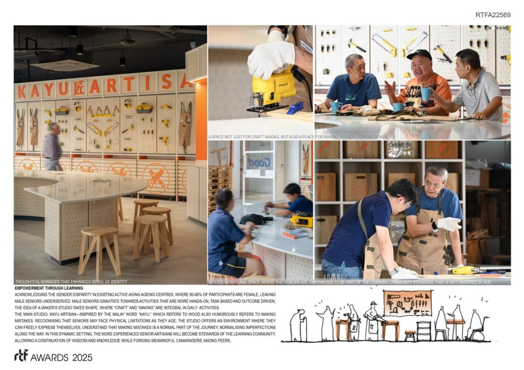 The centre is subdivided into 3 zones to be suited to 3 learning studio settings. The main studio, Kayu Artisan—inspired by the Malay word “kayu,” which refers to “wood” and also humorously refers to making mistakes – recognise that seniors may face physical limitations as they age. The studio hence offers a fun and light-hearted environment where they can freely express themselves, understand that making mistakes is a normal part of the journey, normalising imperfections along the way. In this dynamic setting, the more experienced senior artisans will become stewards of the learning community, allowing a continuation of wisdom and knowledge while forging meaningful camaraderie among peers.