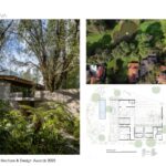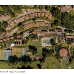 Bedrooms maintain distinct relationships with the exterior. Two on the ground floor open to the courtyard, while the master suite connects to the terrace and rear garden with golf views. A tree grows between the living area and master suite, reinforcing the idea of inhabiting among nature. Upstairs, a playroom and mezzanine-style bedroom host the grandchildren, combining rest with play. Service areas—laundry, machine room, and staff quarters—are accessed independently. A small productive garden with fruit trees near the kitchen provides shade and fresh ingredients.