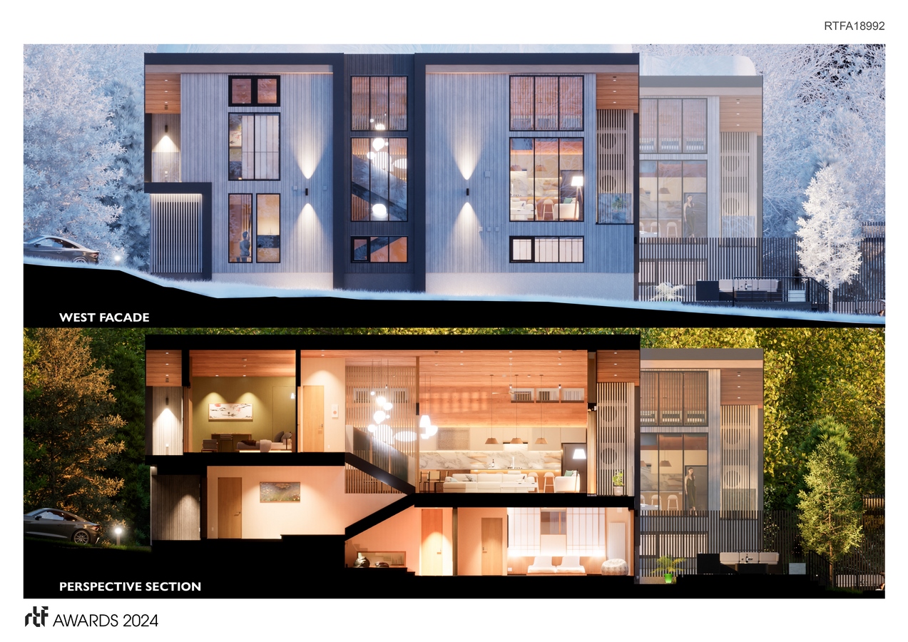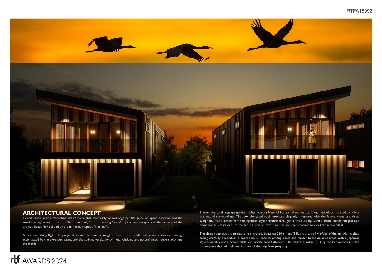 Inspired by Japanese culture and nature’s beauty, ‘Grand Tsuru’ is an architectural masterpiece. The name, meaning ‘crane’ in Japanese, symbolizes the project’s essence, reflected in the mirrored slopes of the roofs. The properties exude a sense of weightlessness reminiscent of traditional Japanese timber framing, accentuated by extended eaves and vertical metal cladding with natural wood louvers on the facade.