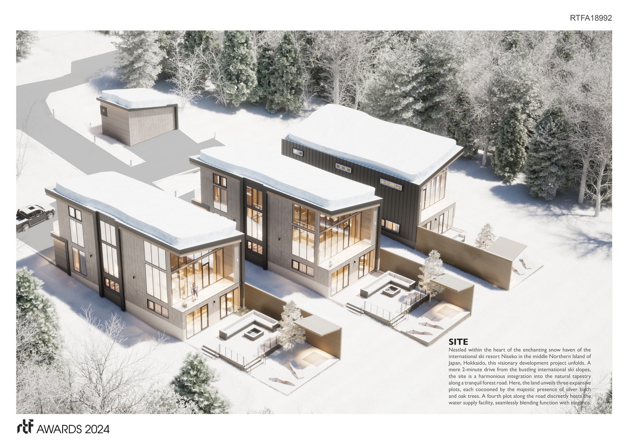 Nestled in the heart of the captivating snow haven of Niseko, a renowned international ski resort in Hokkaido, Japan, a visionary development project named ‘Grand Tsuru’ unfolds. Situated just a 2-minute drive from the lively international ski slopes, the project seamlessly integrates into the natural landscape along a serene forest road.