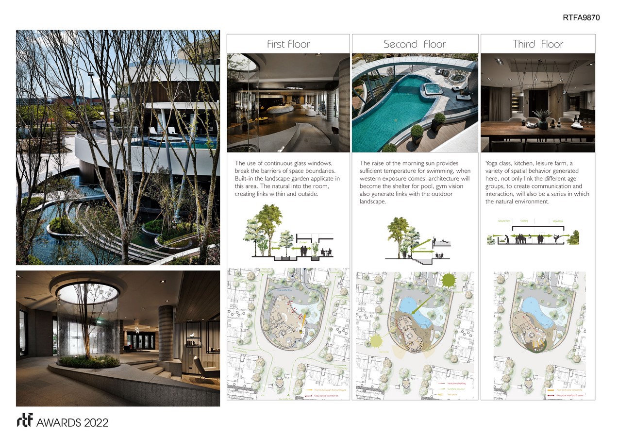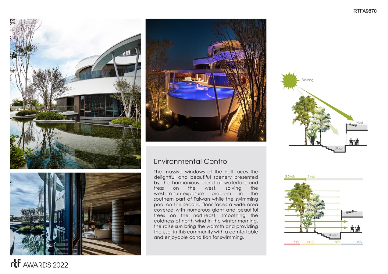 The use of continuous glass windows breaks spatial barriers, inviting nature indoors and creating links between inside and outside. Tainan due to its location, is an intensely hot city. To solve the western-sun-exposure problem common in Taiwan, a solid wall is positioned on the west of the building, reducing the impact of intense sunlight on the interior temperature. Additionally, the second floor swimming pool faces a blockade of trees on the east side, moderating the temperature on cold winter mornings. The sun brings warmth during the rare cold days and the building’s design provides shelter for the pool.