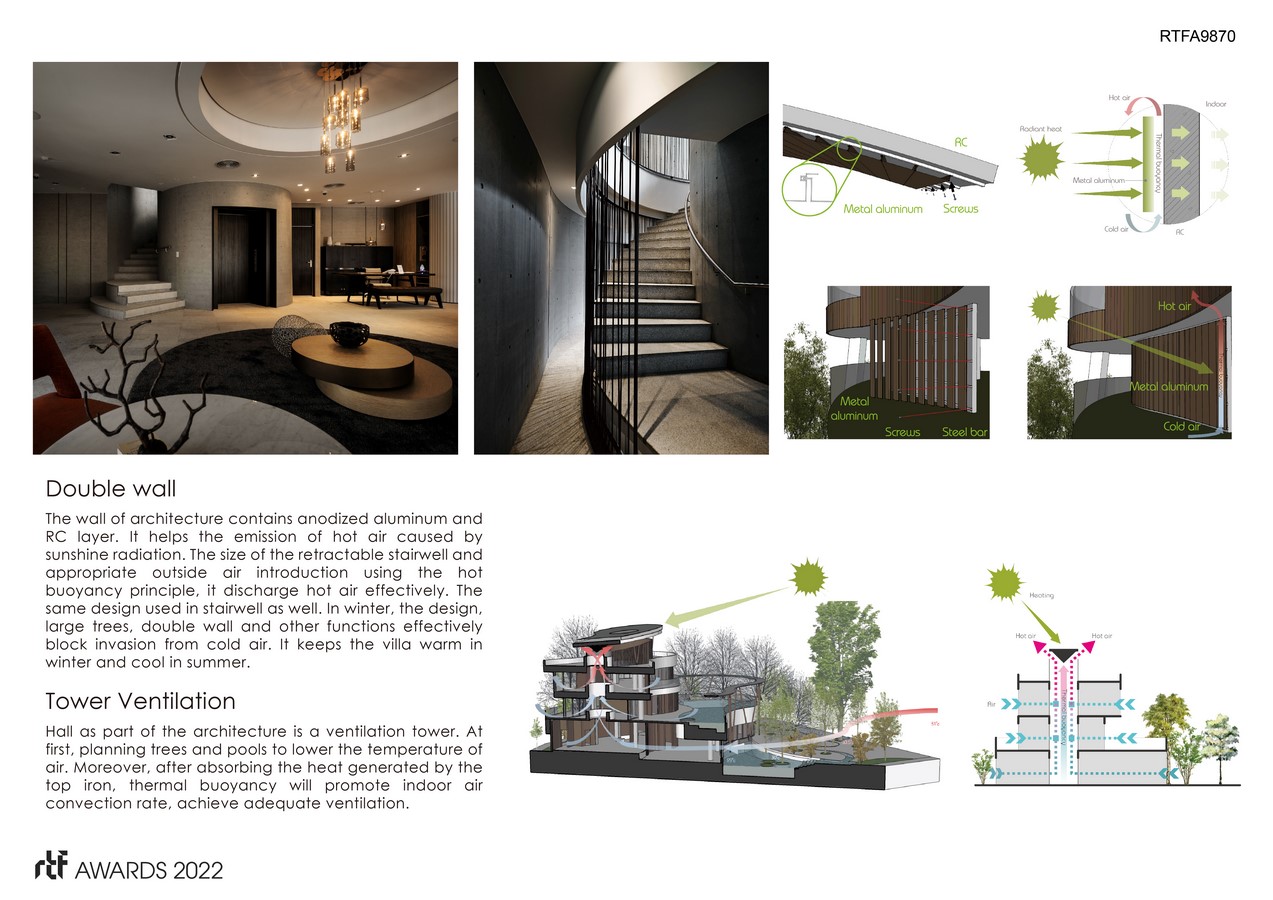 The structure of the walls contain an anodized aluminum RC layer. When the cold air enters the gap between layers it helps drive out the hot air caused by the intense sunshine. The size of the spiraling stairwell and the air introduced from the outside utilize the hot buoyancy principle effectively dissipating hot air. In winter, the design, large trees, double wall and other functions effectively block contact with the cold air. It keeps the villa warm in winter and cool in summer. Another essential structural element to the design is the tower ventilation. Initially the trees and pools help lower the temperature of the air but the ventilation tower does the real work. It helps promote indoor air flow after absorbing the heat generated by the iron roof. Thermal buoyancy helps to promote the indoor air convection rate and manages to achieve adequate ventilation.
