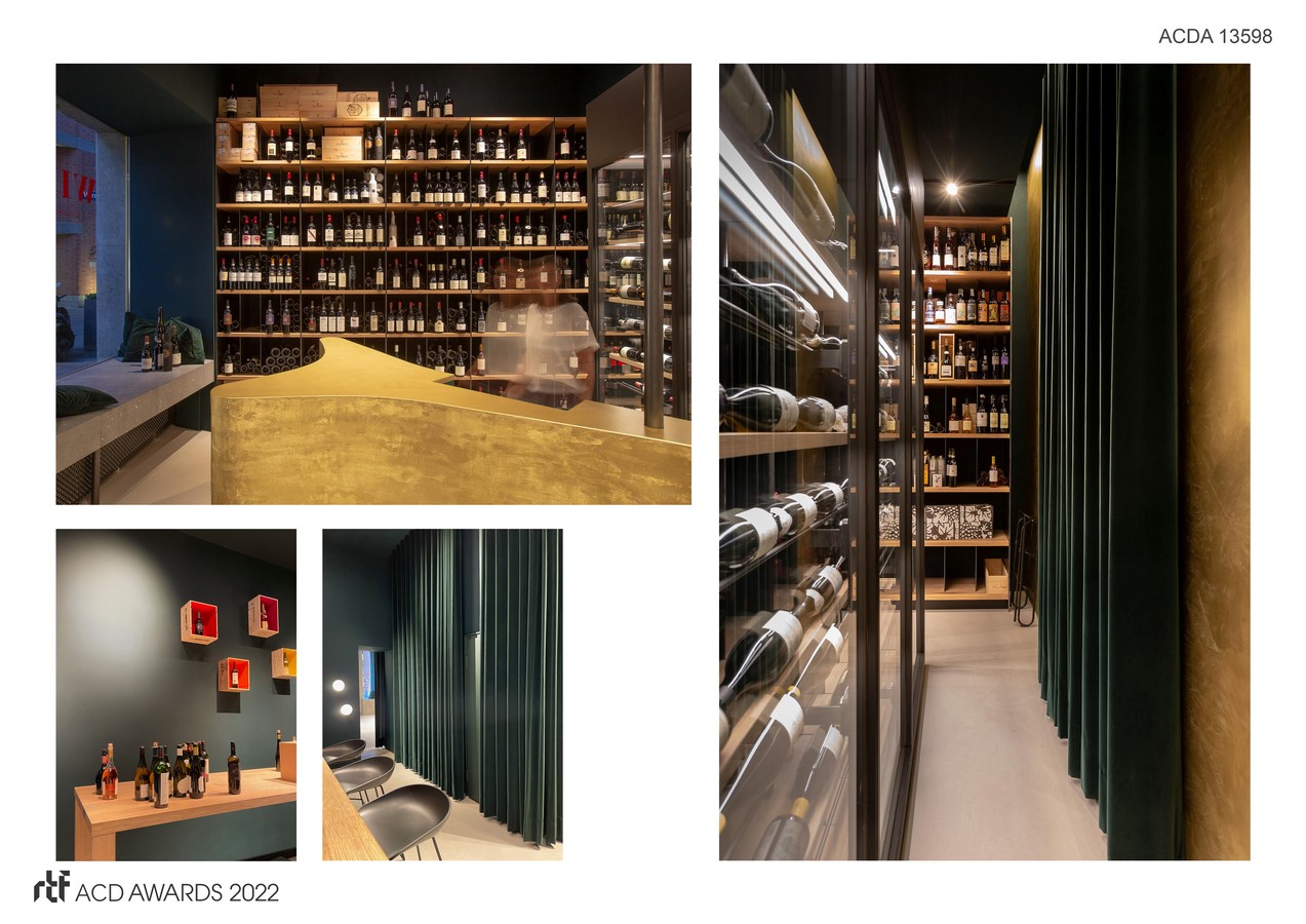 An extra backstage area with facility rooms for tastings is hidden by a dark green curtain.