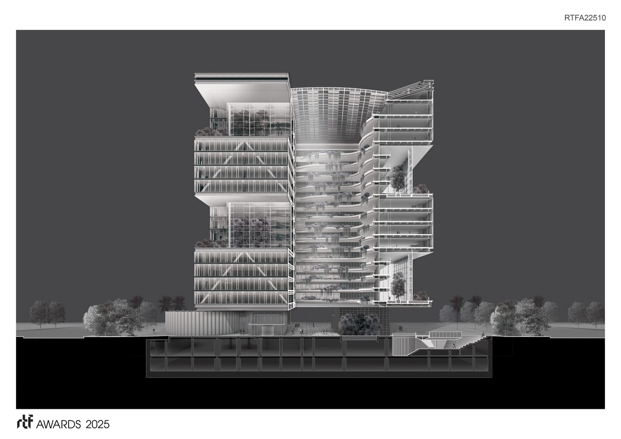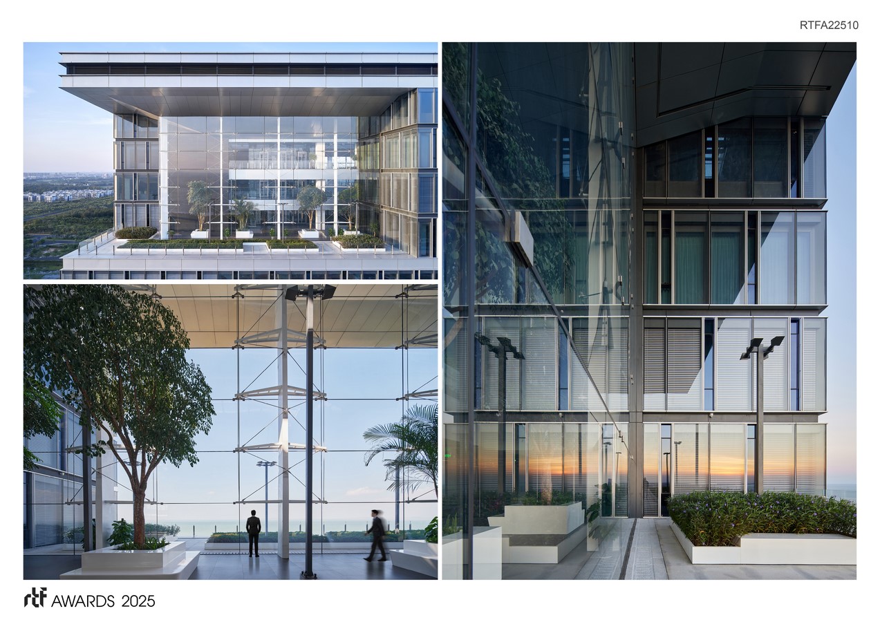 None of the pillars interrupts the spacious sky gardens that rotate every four levels, allowing the volume of the other four floors above to cantilever up to 14 meters. This is achieved through mega-bracings that minimize the lateral deflection of the structure, and provide a feasible solution for strengthening earthquake resistance.