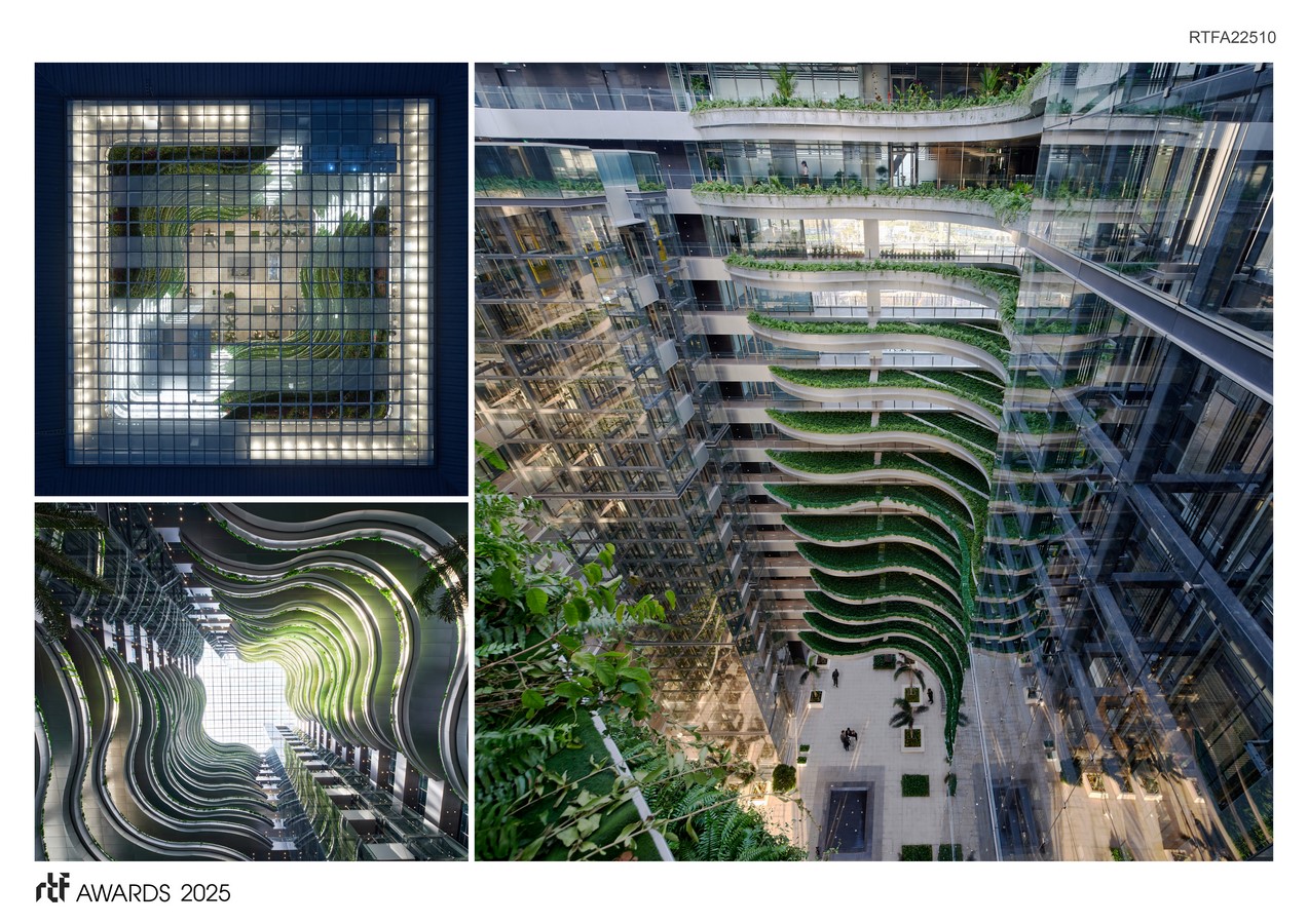 Greenery is maximized with the exterior sky gardens as well as abundant planting in the interior. The sky gardens punch in opposing corners in an orderly fashion, occurring every four floors and rotating 90 degrees each time. Inside, multiple tiers of curving balconies span the spaces between the elevator boxes and these are densely packed with unruly plants that spill out over their edges. This is a nature-filled space, designed to provide employees with a sense of peace and well-being.