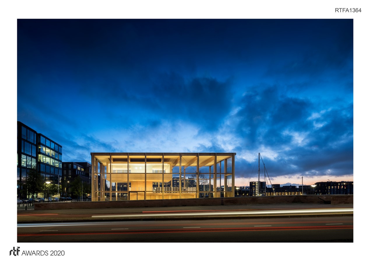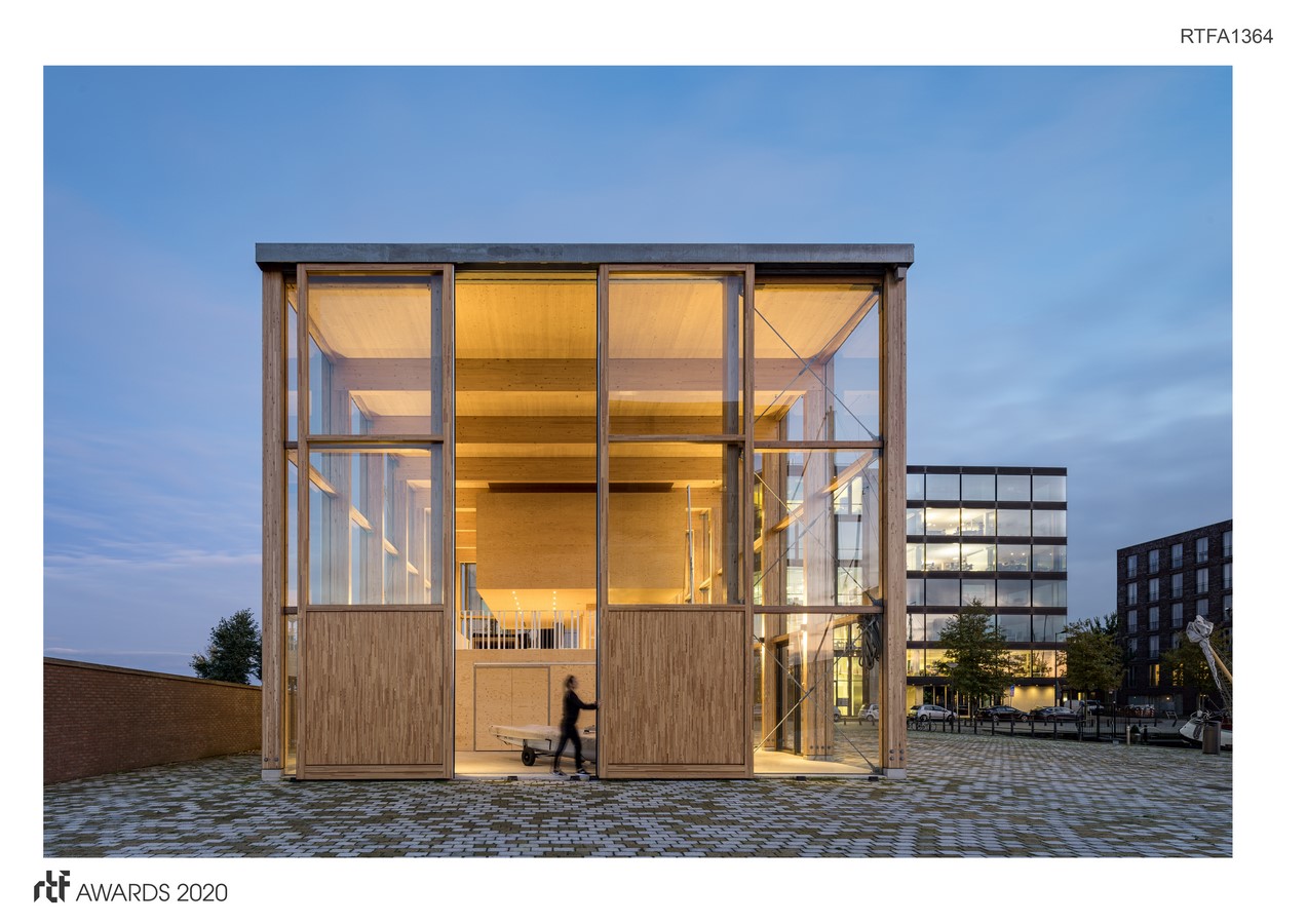 The outer single glazed volume is a simple wooden construction consisting of seven laminated Larch portal frames. All larch used in the building was locally sourced. Larch corner columns combined with steel roof beams are utilized at the end facades to create maximum openings. The nine-meter-high structural elements also serve as window frames for large single glazed panels, to achieve a minimum detail solution. The 2,5-meter roof span is achieved with 8cm. thick panels of cross-laminated timber. Within this enclosure is a contrasting volume also constructed entirely from wood. The relationship between this freestanding interior volume and the larger, transparent enclosure creates a series of interesting spaces, each with its specific atmosphere and character. The upper floor meeting room is literally hung from 70cm. high laminated wooden beams, by means of minimal steel hangers to achieve a completely freestanding interior volume.