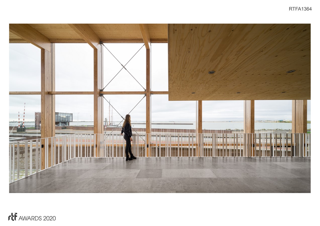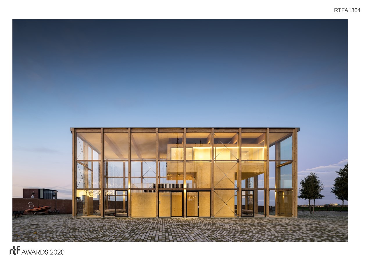The choice of wood as the primary construction material differentiates the building from its surroundings. Nine-meter larch columns refer back to the tall ships’ masts in the adjacent harbor. The rhythm of the seasons largely dictates the programmatic requirements of the clubhouse. A water sports club is by definition less active in the cold, winter months and requires less space. In contrast, during the warmer months, a bigger building is needed to accommodate more activities. The “volume inside a volume” strategy differentiates fully insulated/climatized spaces with specific programmatic designations and larger more flexible half-climate spaces behind single glazing. This strategy has two important advantages. Firstly, it provides a buffer of air space that surrounds and thus insulates the fully climatized spaces. It is therefore extremely energy efficient. Even more significant, the “volume inside a volume” strategy allows the water sports club to realize a maximum of usable space within a limited budget.