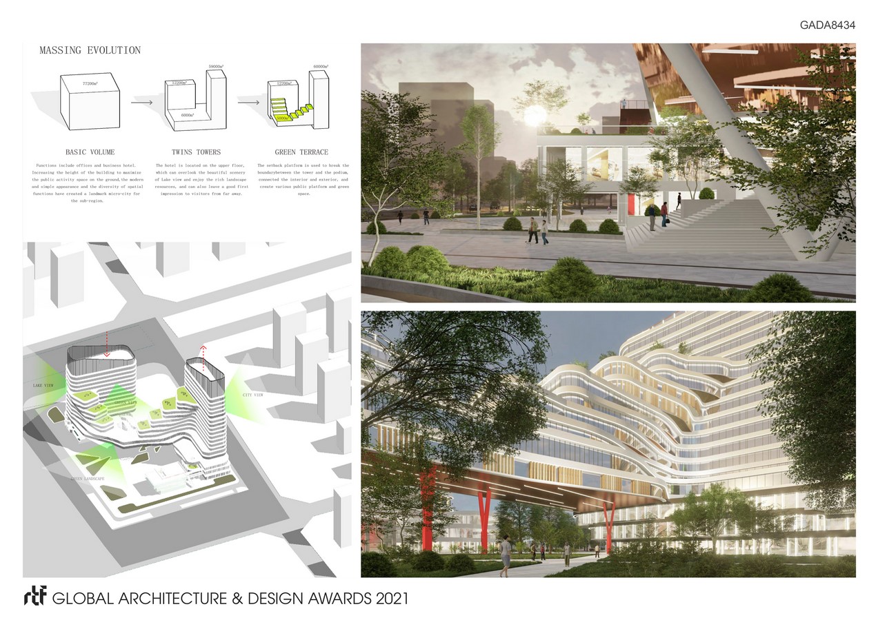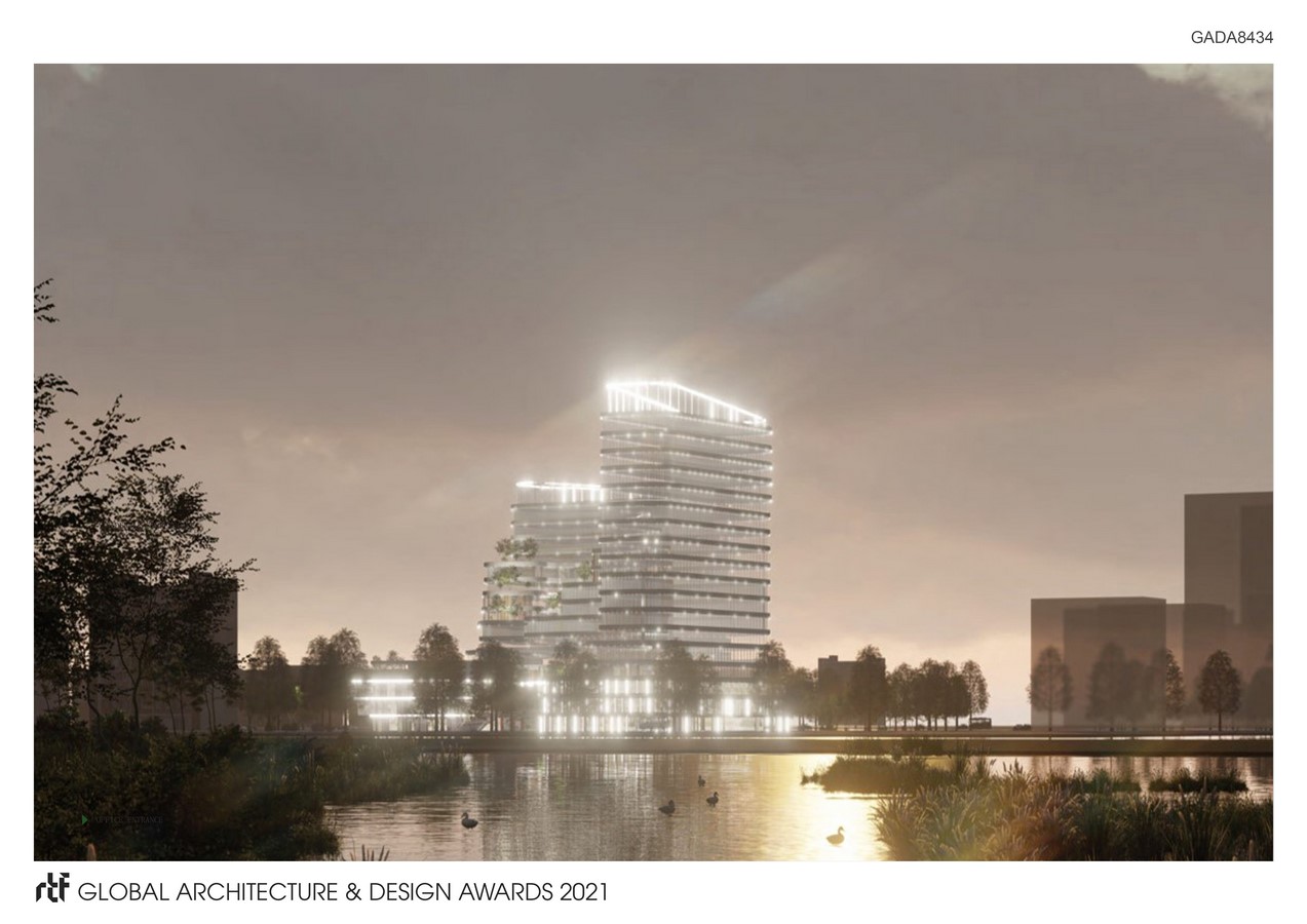The design concept of “CLOUD LADDERING”. The twin towers carry the main functions, including office, multi-function services, hotels and small business facilities.