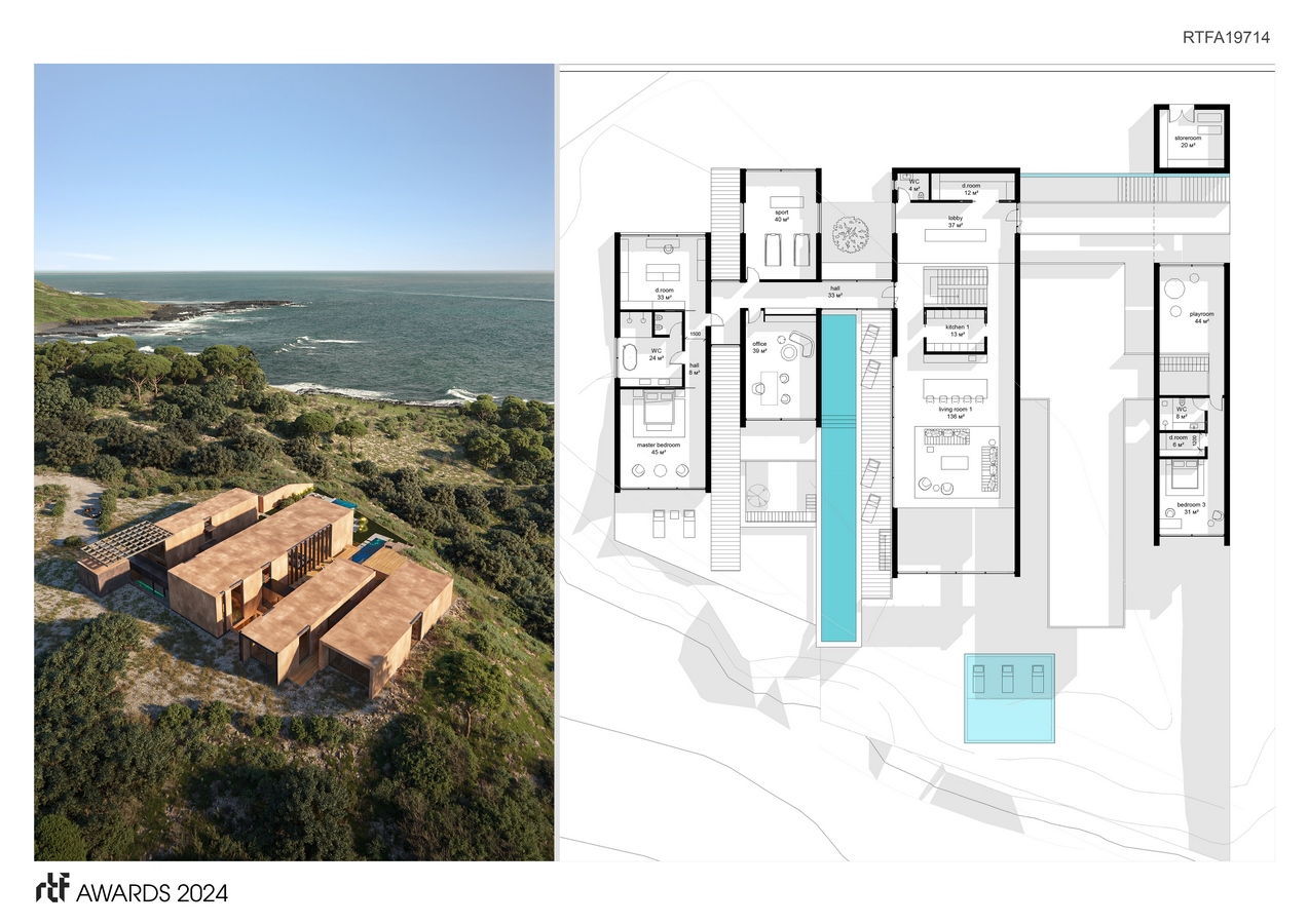 The 800 sq. m house is on a cliff, near the ocean. The main requirement of the local municipality was that the house should be practically invisible, minimally change the local landscape, and not stand out in the environment, since the cliff in which it is located is visible from the downtown.