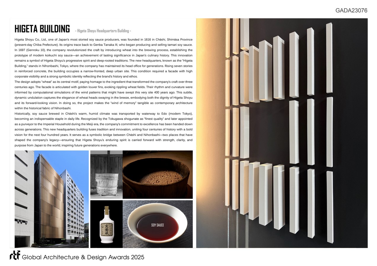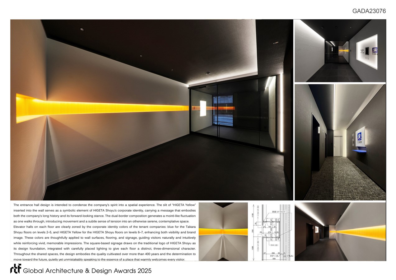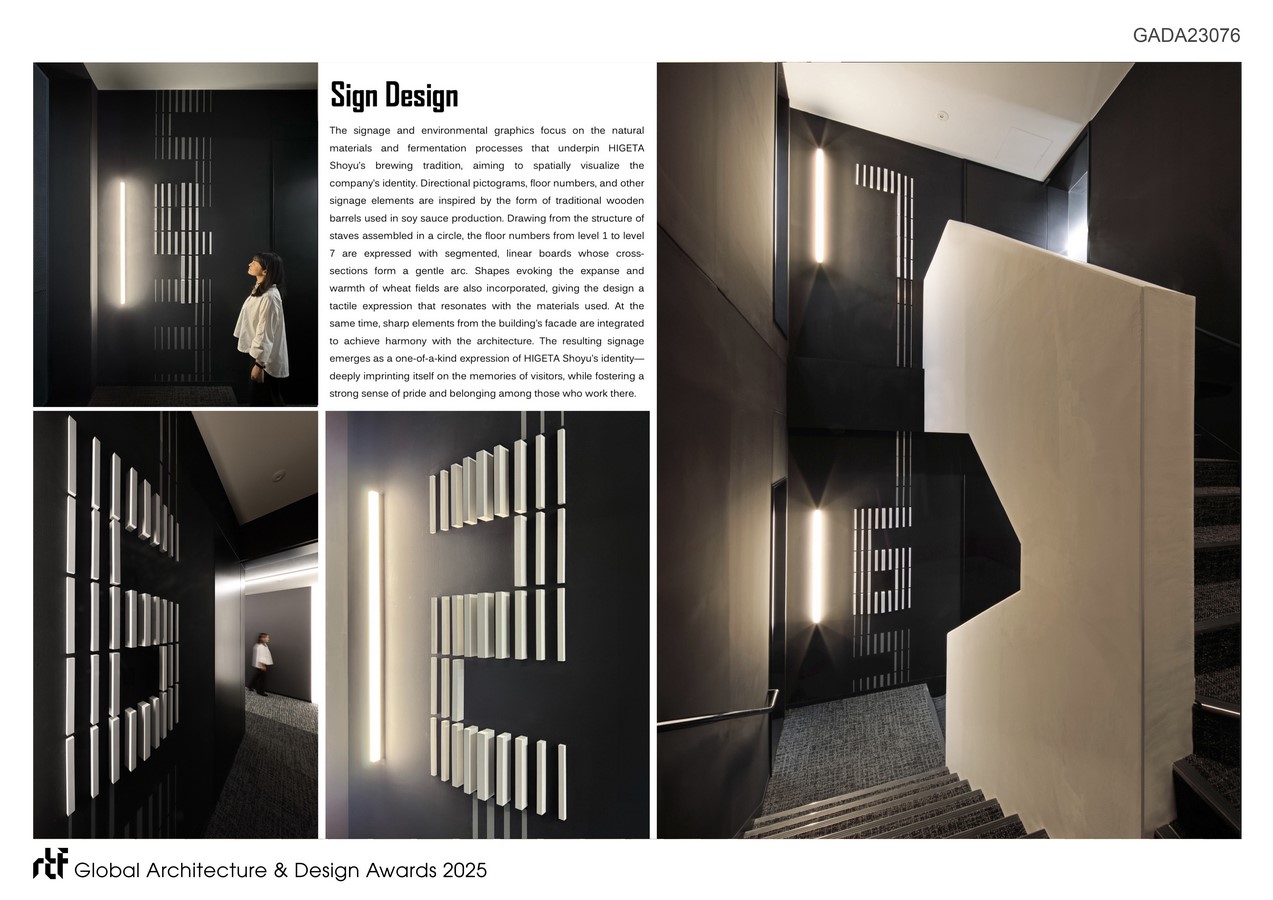 This transformative act has defined Japan’s culinary heritage and remains a symbol of Higeta Shoyu’s progressive spirit. The new headquarters in Nihonbashi, Tokyo, embodies this four-hundred-year legacy, merging tradition with a bold vision for the future. Within this architectural framework, the signage and environmental graphics have been conceived as a profound spatial articulation of corporate identity.