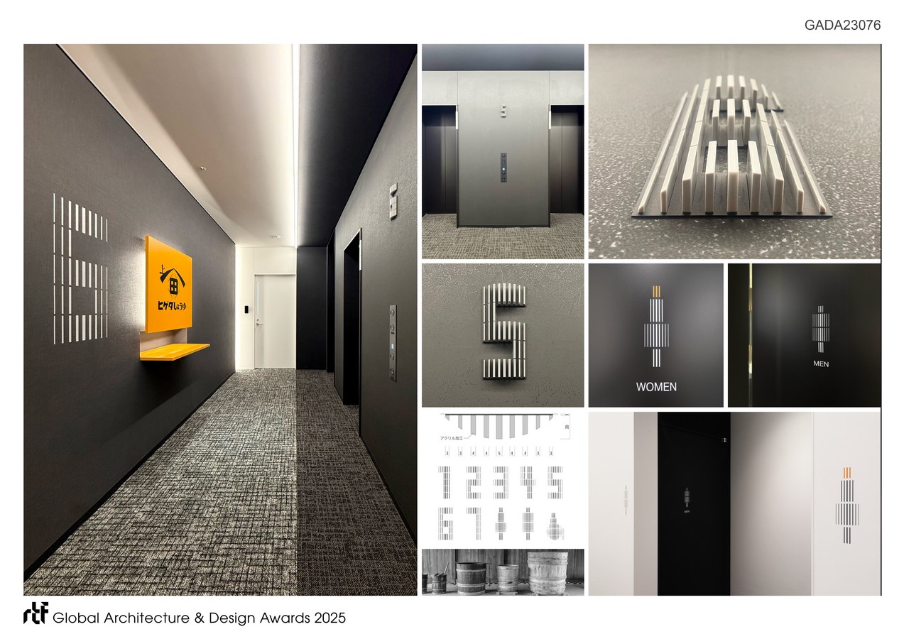 The environmental graphics draw inspiration from the natural materials and fermentation processes that anchor the brand’s craft. Pictograms, directional signs, and floor numbers reinterpret the circular structure of traditional wooden barrels used in soy sauce brewing. Each floor number, from one through seven, is composed of segmented, linear boards whose cross-sections arc gently, echoing the curvature of barrel staves. This design vocabulary transforms functional elements into tactile reminders of cultural continuity.