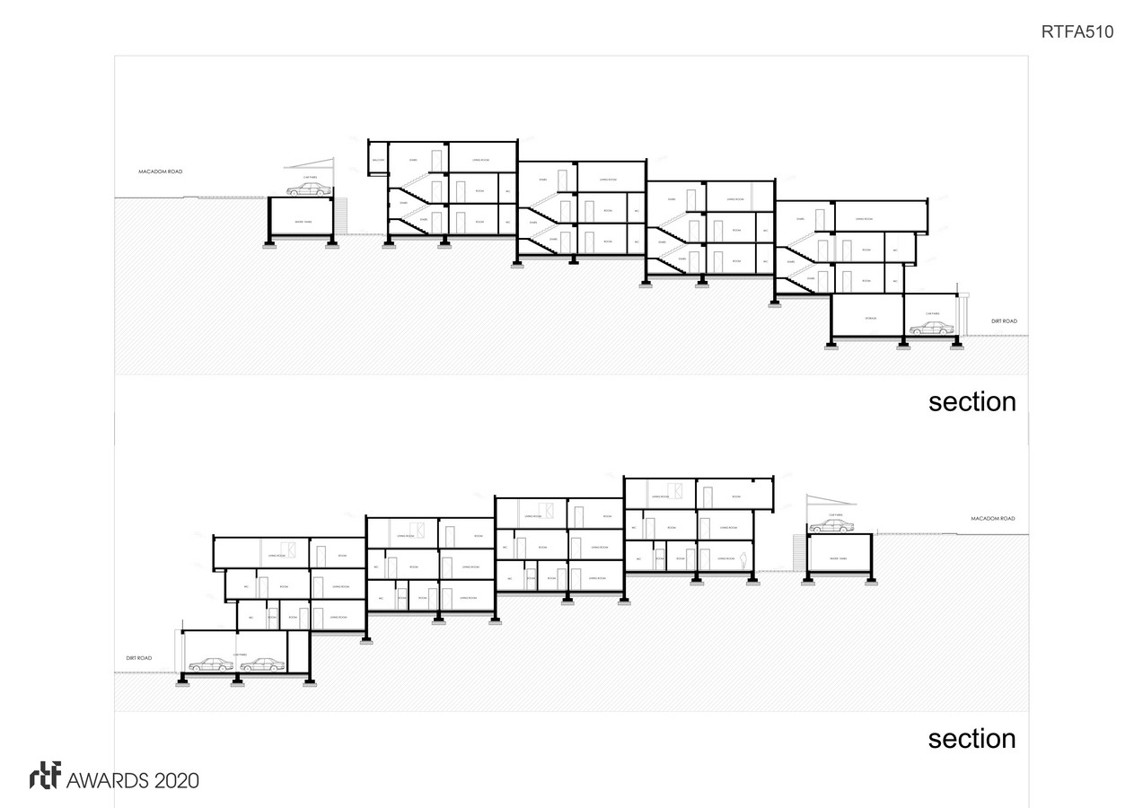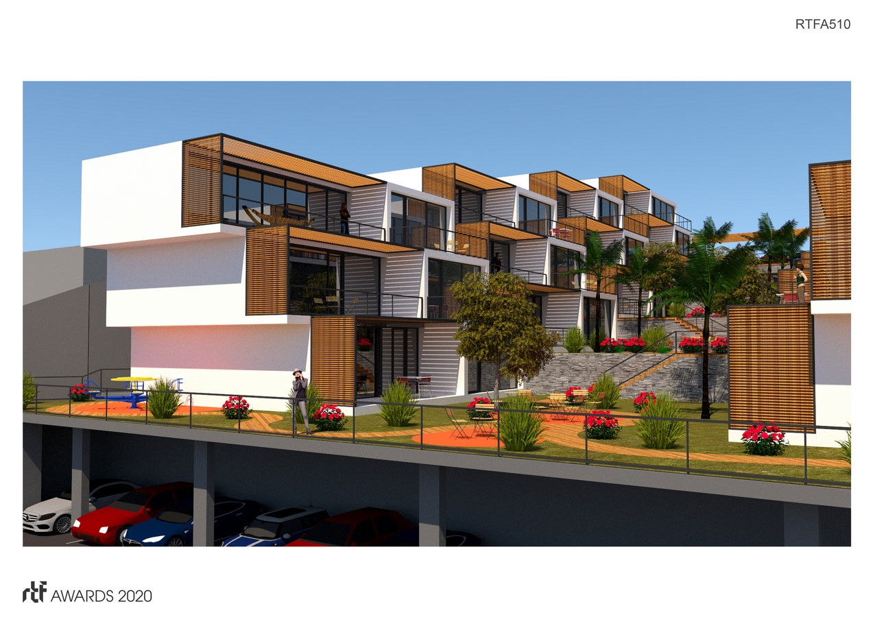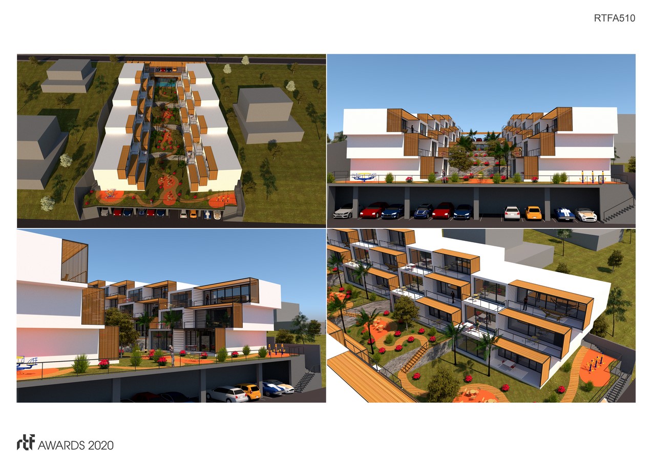 The project was designed as 2 housing blocks. The blocks were placed gradually according to the terrain slope. The blocks were arranged gradually in the direction of the slope and were designed gradually by retracting towards the upper floors. These stages in two directions refer to the topography of Rwanda consisting of hills.