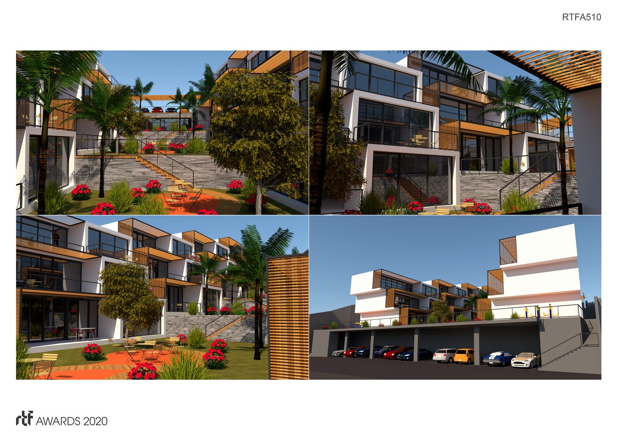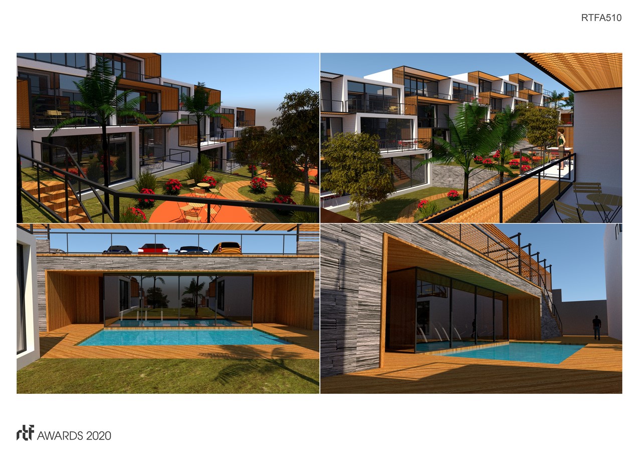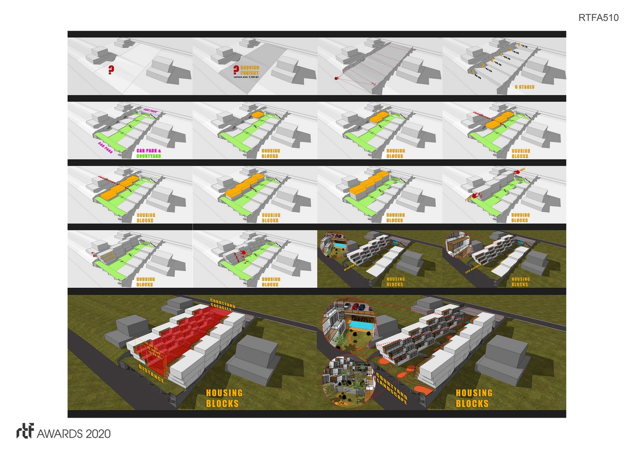 The project was designed as 2 housing blocks. The blocks were placed gradually according to the terrain slope. The blocks were arranged gradually in the direction of the slope and were designed gradually by retracting towards the upper floors. These stages in two directions refer to the topography of Rwanda consisting of hills.