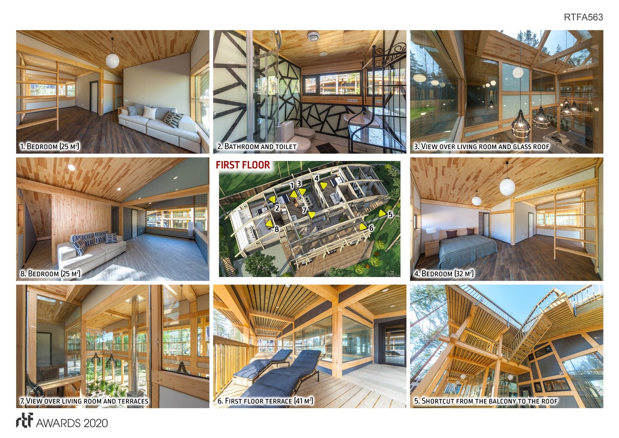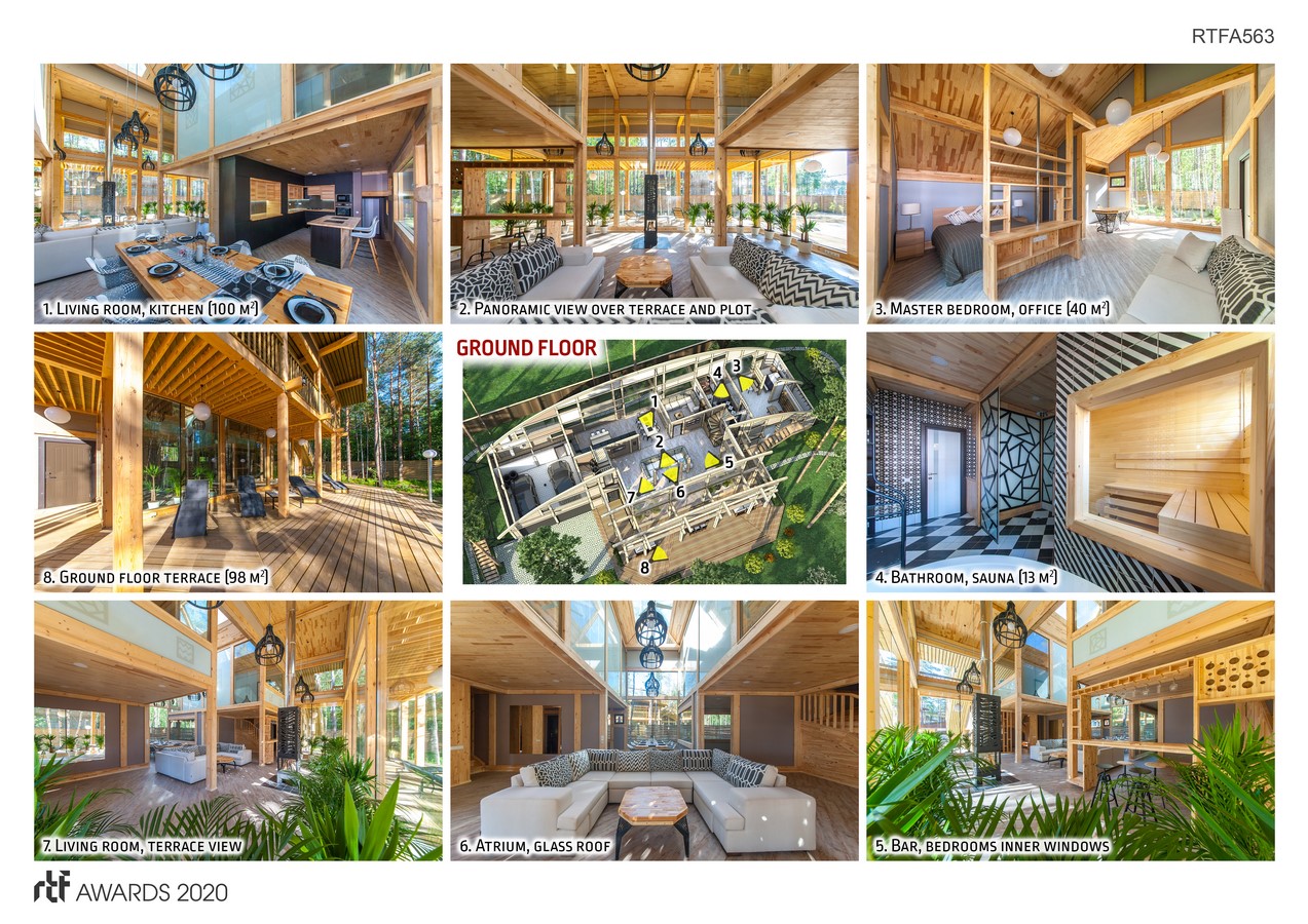 The spacious 360 m2 house comprises a large living room with a kitchen area, 4 bedrooms with private bathrooms, a guest room, a garage and a large number of utility rooms. The total usable area, including outdoor terraces, balconies and a rooftop park exceed 900 m2.