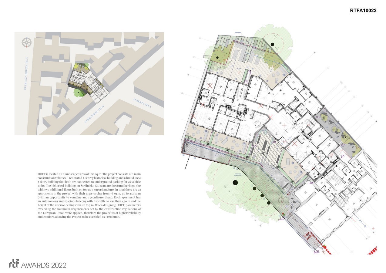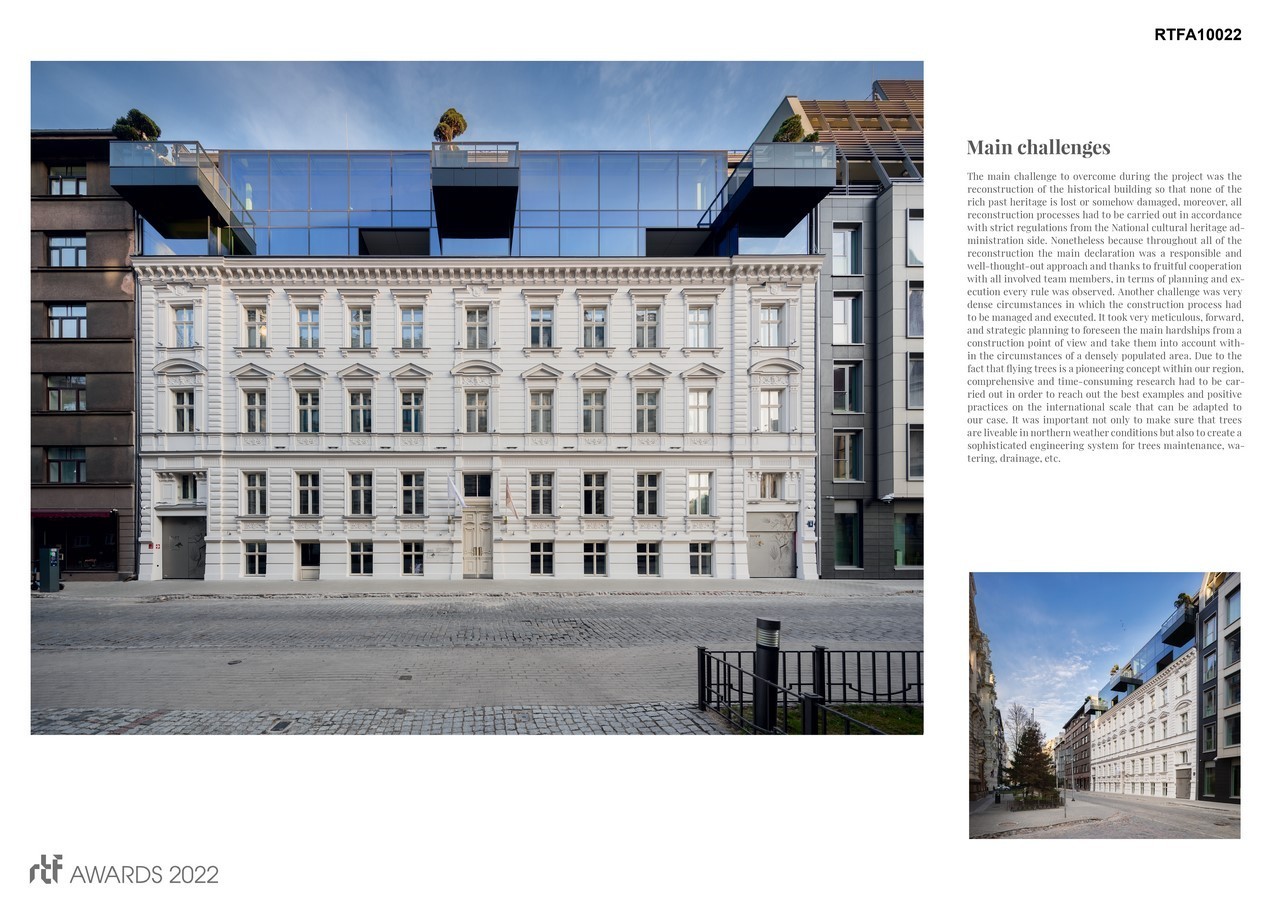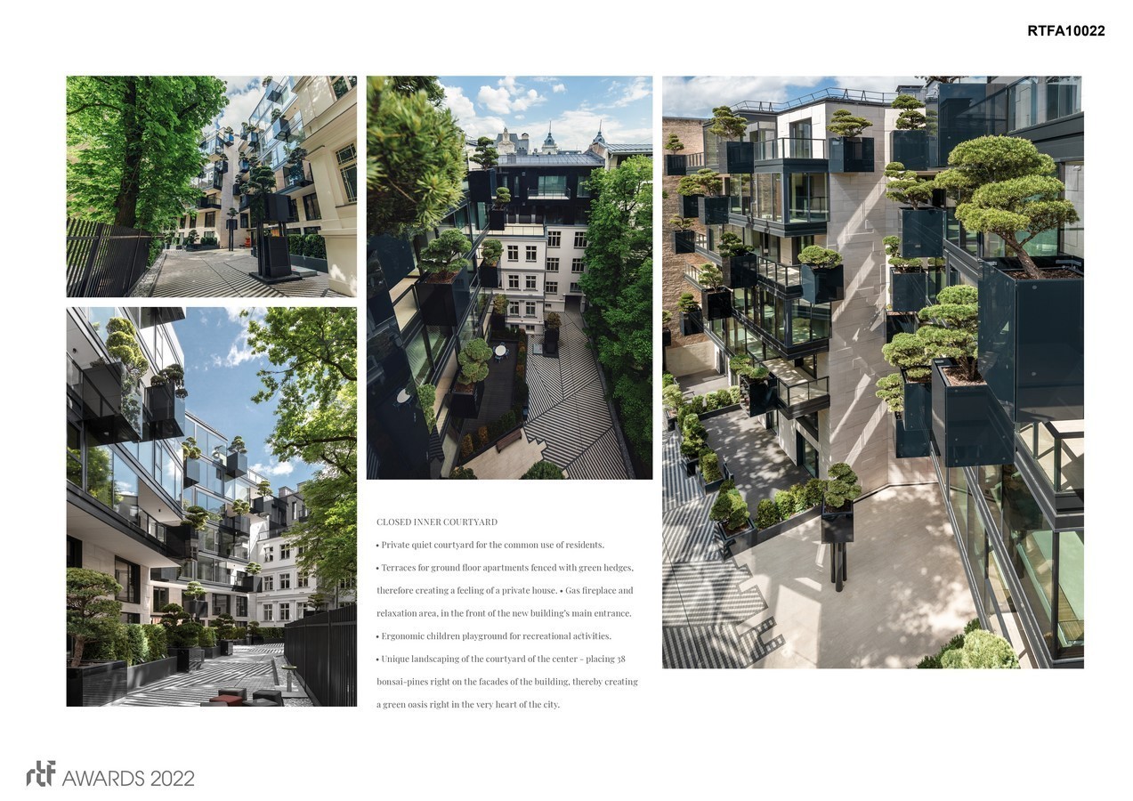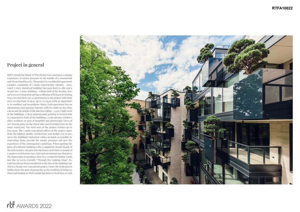 HOFT stands for House Of The Flying Trees and gives a unique experience of nature presence in the middle of a commercial and always bustling city. The project is a residential apartment complex, consisting of 2 main construction volumes – renovated 5-story historical building that goes back to 1881 and abrand-new 7-story building – within both of the facades, bonsai trees are integrated, giving an illusion of flying or levitating trees.