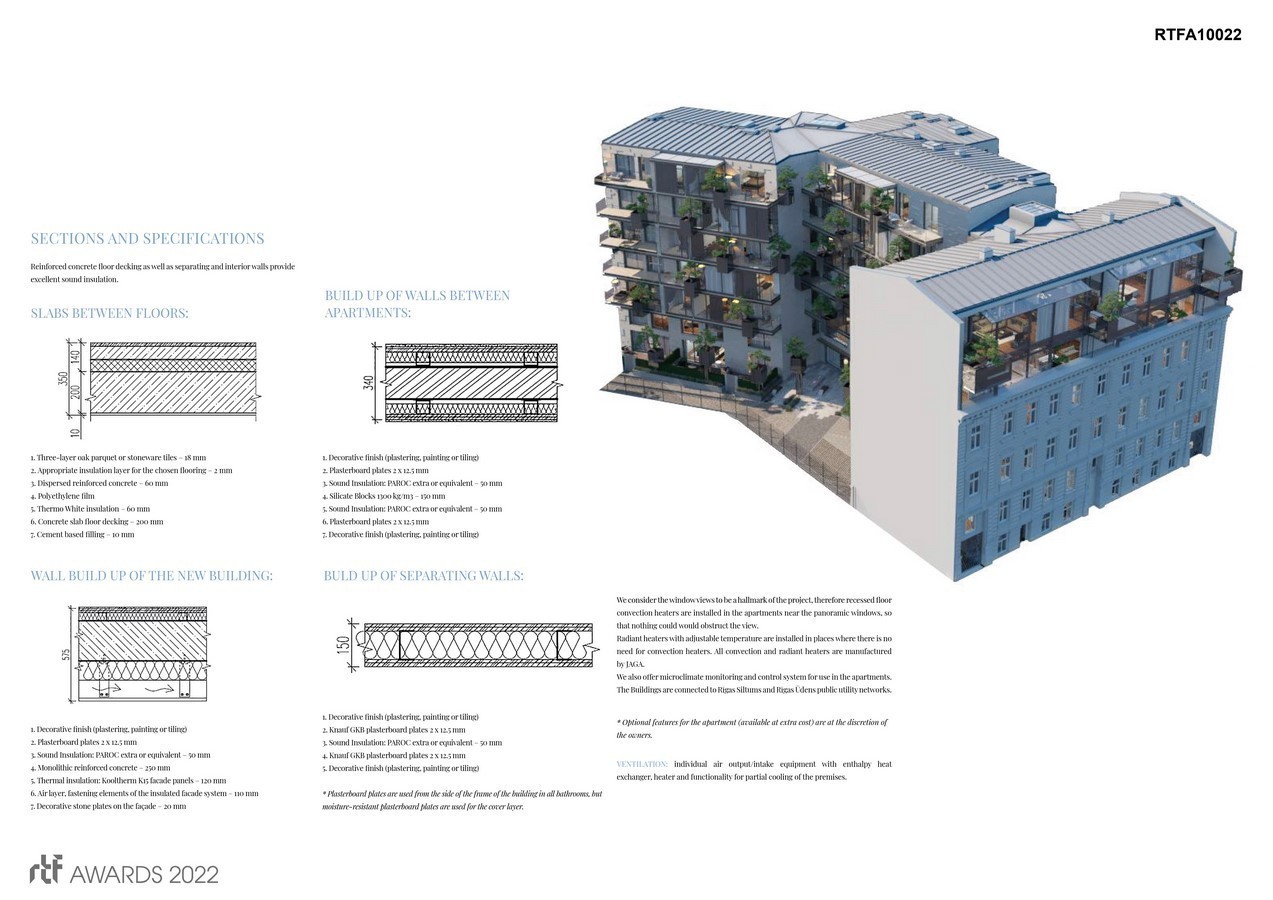 In total there are 42 apartments in the project with their area varying from 76 sq.m. up to 232 sq.m (with an opportunity to combine and reconfigure them). Each apartment has an autonomous and spacious balcony with its width no less than 1,80 m and the height of the interior ceiling – 2,9 m. Under both ofthe buildings, 2-level underground parking is located that is connected to both of the buildings. Large picture windows allow residents to gaze at beautiful and picturesque views of ArtNoveau gems on the street side and levitating trees in the inner courtyard. The total area of the project reaches up to 8337 sq.m.