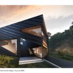 The main exterior façade material is standard dimension metal siding, applied and finished with non-standard methods. The siding’s oblique orientation along the axis of the hollow cut volume, continuous wrapping around vertical edges of the house, and brown/black matte finish recreate textural qualities of old farm structures with a budget-conscious material. While designed in a contemporary approach to form making, the house is intended to an aesthetic complement to historical agricultural architecture in the Hudson Valley region of New York State.