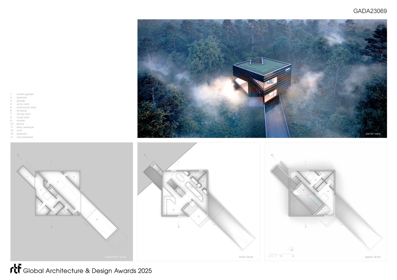Hollow House is based on a simple idea – a rectilinear volume with a hole cut completely through it. Orienting the hollow cut volume at an oblique to the rectilinear volume puts conventional domestic space planning in tension with unconventional form. From the exterior, the house is perceived as a strange reinterpretation of the courtyard typology, instead of an outdoor living space, the void is a physically inaccessible shaft pointed toward the sky. From the interior, the hollow void is perceived as a solid volume alternately interrupting space to define separate rooms, and stretching space along unexpected axes.