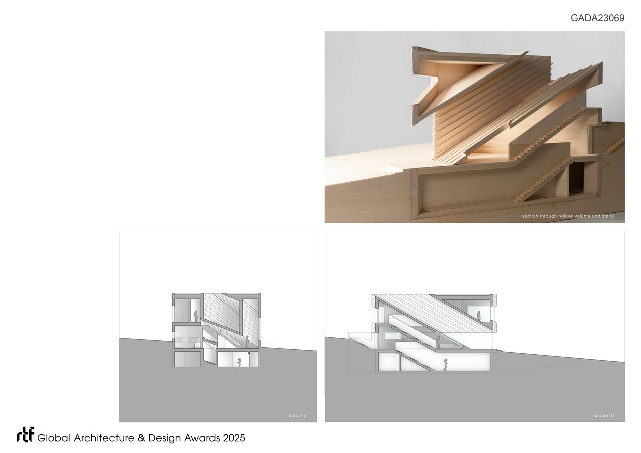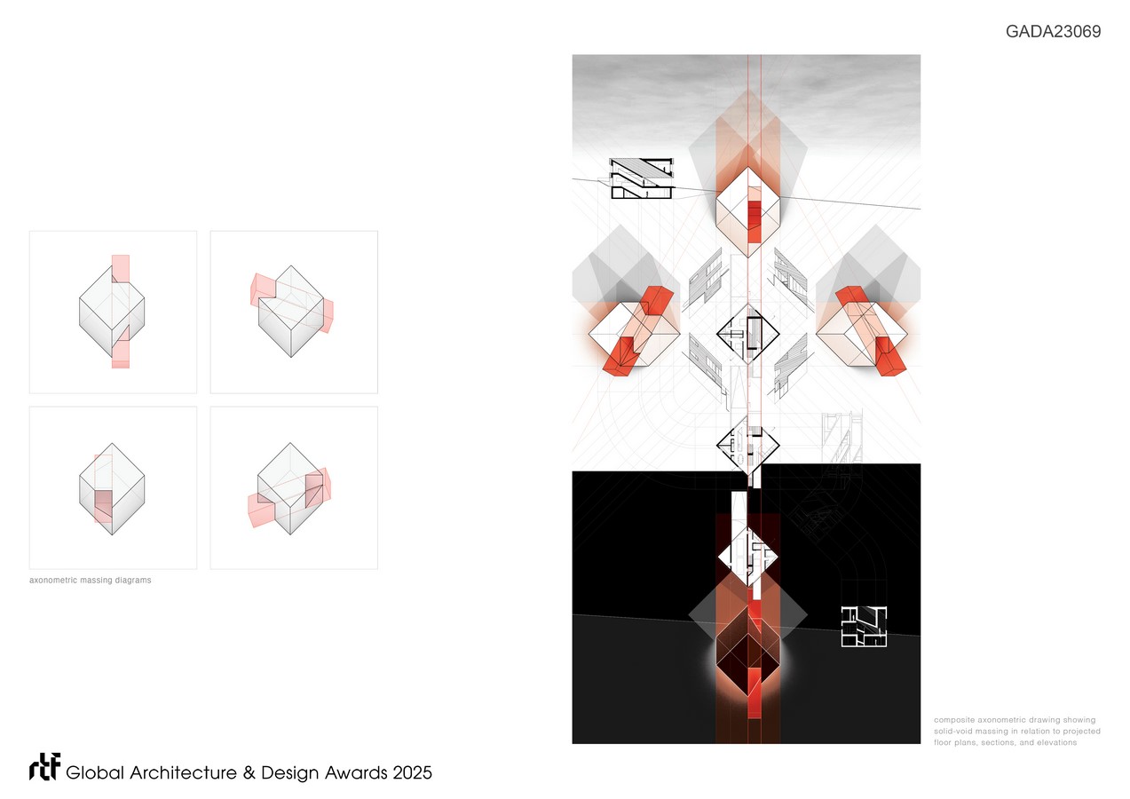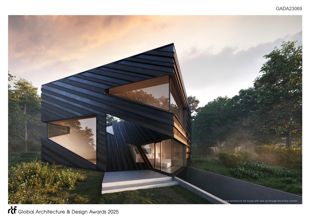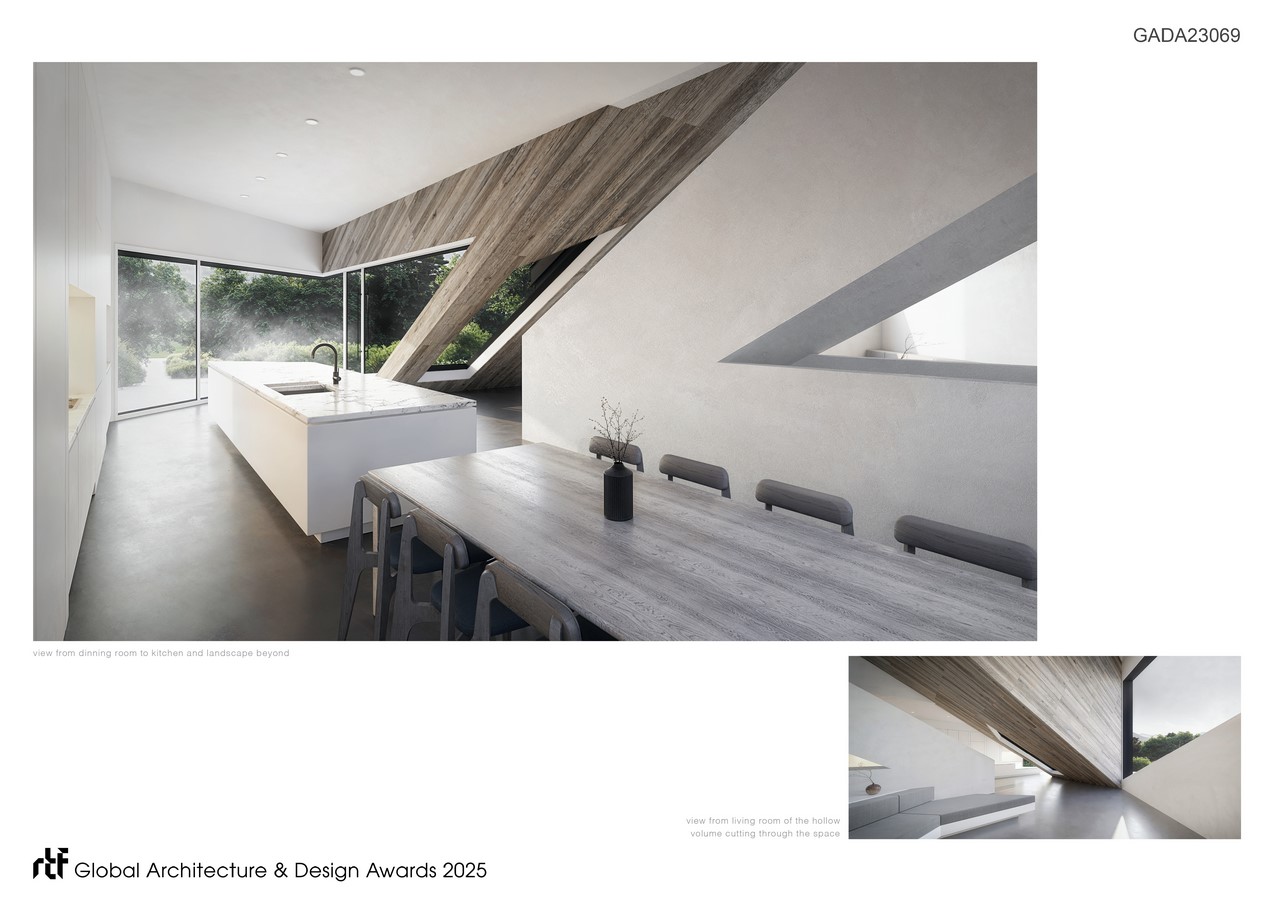 Hollow House is based on a simple idea – a rectilinear volume with a hole cut completely through it. Orienting the hollow cut volume at an oblique to the rectilinear volume puts conventional domestic space planning in tension with unconventional form. From the exterior, the house is perceived as a strange reinterpretation of the courtyard typology, instead of an outdoor living space, the void is a physically inaccessible shaft pointed toward the sky. From the interior, the hollow void is perceived as a solid volume alternately interrupting space to define separate rooms, and stretching space along unexpected axes.