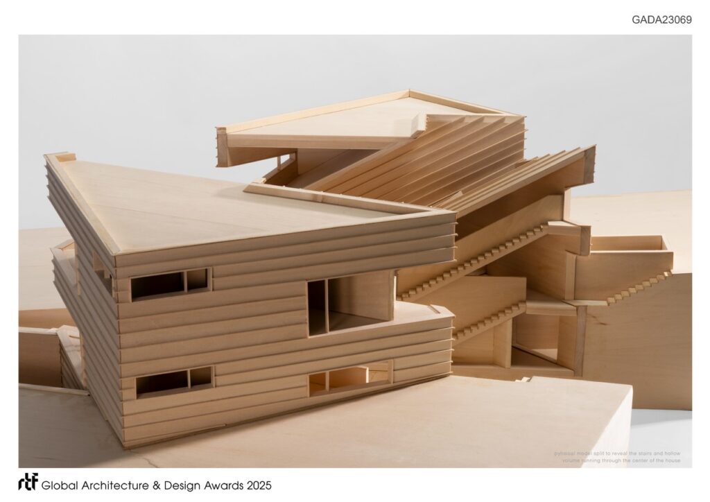 Hollow House is based on a simple idea – a rectilinear volume with a hole cut completely through it. Orienting the hollow cut volume at an oblique to the rectilinear volume puts conventional domestic space planning in tension with unconventional form. From the exterior, the house is perceived as a strange reinterpretation of the courtyard typology, instead of an outdoor living space, the void is a physically inaccessible shaft pointed toward the sky. From the interior, the hollow void is perceived as a solid volume alternately interrupting space to define separate rooms, and stretching space along unexpected axes.