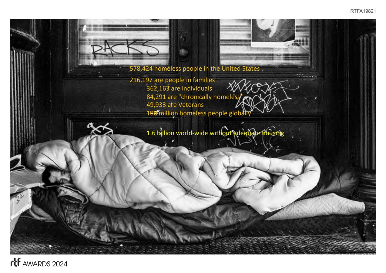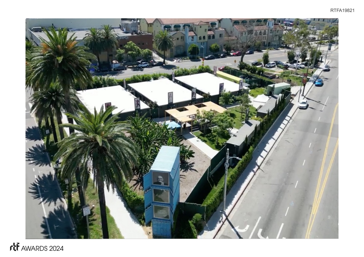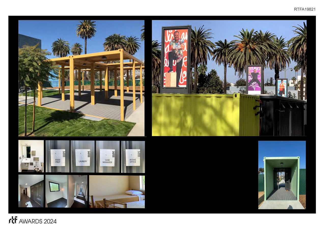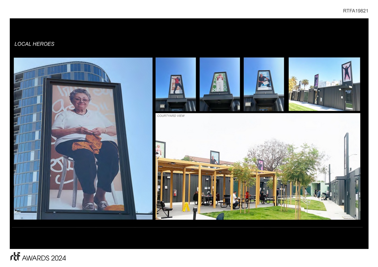 A courtyard parti is the basic ordering principle on the triangular site. Encouraging social/human interaction – the courtyard provides a safe haven for residents who’ve recently experienced the brutalities of life on the streets. Guided by on-site professional service providers, the goal for residents is re-insertion into LA as self-sustaining, productive members of society. Lining the courtyard, stationed at each door, are portraits of unknown local heroes – prominently integrated into the architecture. These larger than life, 9’ tall images, along with a 4-story “HOPE Tower” celebrate “ordinary people doing extraordinary things”. The portraits signify HOPE – each panel making the invisible, visible. Images of everyday heroes who bring positive change to LA – all accessible to the residents and representative of a tangible life of positive change. Concurrently, the container modules serve as a powerful metaphor – embodying the difficult journey of transition – a transition away from life on the streets towards a self-sustaining lifestyle – a human re-birth – is similar to the evolution and industrial re-birth of the container, re-inventing oneself, picking oneself up off the floor, navigating and adapting to life’s changing landscape, etc. are all examples of humans (like the containers) in an expanded and re-adapted transition.