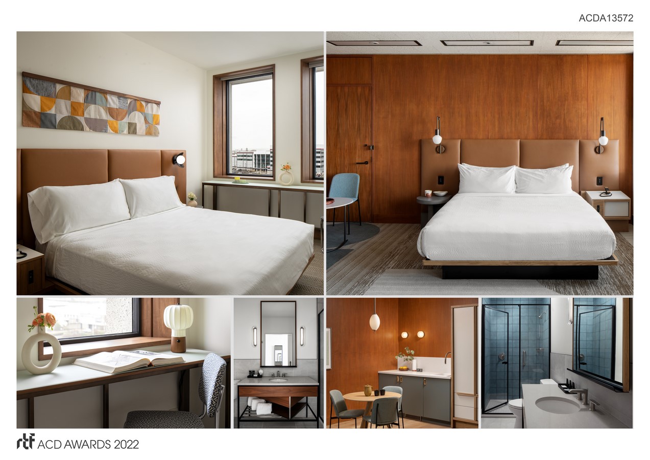 Hotel Marcel’s 165 guest rooms utilize concrete gray, caramel vinyl and walnut, emphasized by pops of muted dark green and sienna and decorative lighting, plus Breuer’s famous Cesca chair. Following the original floor plans of the offices, the rooms achieve an openness through custom designed interlocking furniture.