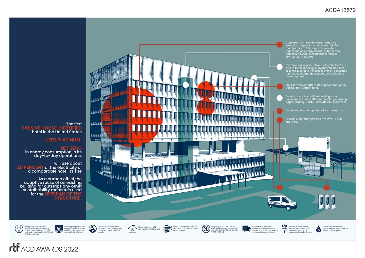 After one year of operation, the building’s performance will be evaluated in order to attain net-zero status. The building’s roof and parking canopies are covered with 1,000 photovoltaic panels, with the goal of returning more energy to the grid than is taken. A power-over-ethernet system powers lighting, motorized window treatments, and guest room refrigerators, reducing overall energy use by more than 30%. Building materials were repurposed throughout, such as the historic housings of the original lights, which have been reinstated with energy-efficient lamping, and the restored wood-paneled walls in suites which were once the executive offices. The reuse of an existing structure, however, serves as the most significant act of sustainability.