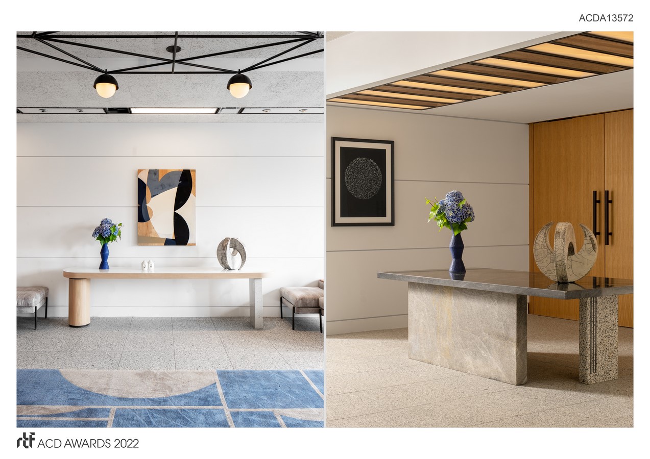 The inviting lobby space features a palette of warm earth tones and a custom wood reception desk alongside a feature wall of terracotta in a Cle Tile, referencing the original laboratory floors. An existing depressed floor plate became a sunken lounge, also serving as pre-function space. The furniture, carpets, area rugs and lighting are custom designed by Dutch East, deploying Bauhaus-inspired patterning throughout, a nod to Breuer’s alma mater. The historic ceiling has been replaced in kind with added touches to respond to the interior layout, providing an open ceiling plane that accommodates the reimagined original architectural lighting system with new custom faceted wood and acrylic lens panels.