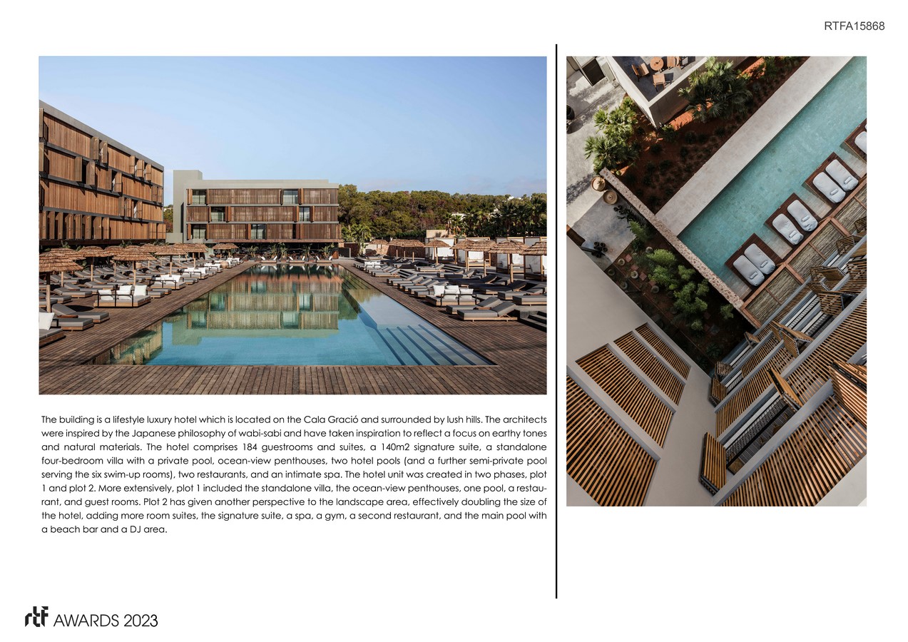 The building is a lifestyle luxury hotel which is located on the Cala Gració and surrounded by lush hills. The architects were inspired by the Japanese philosophy of wabi-sabi and have taken inspiration to reflect a focus on earthy tones and natural materials.