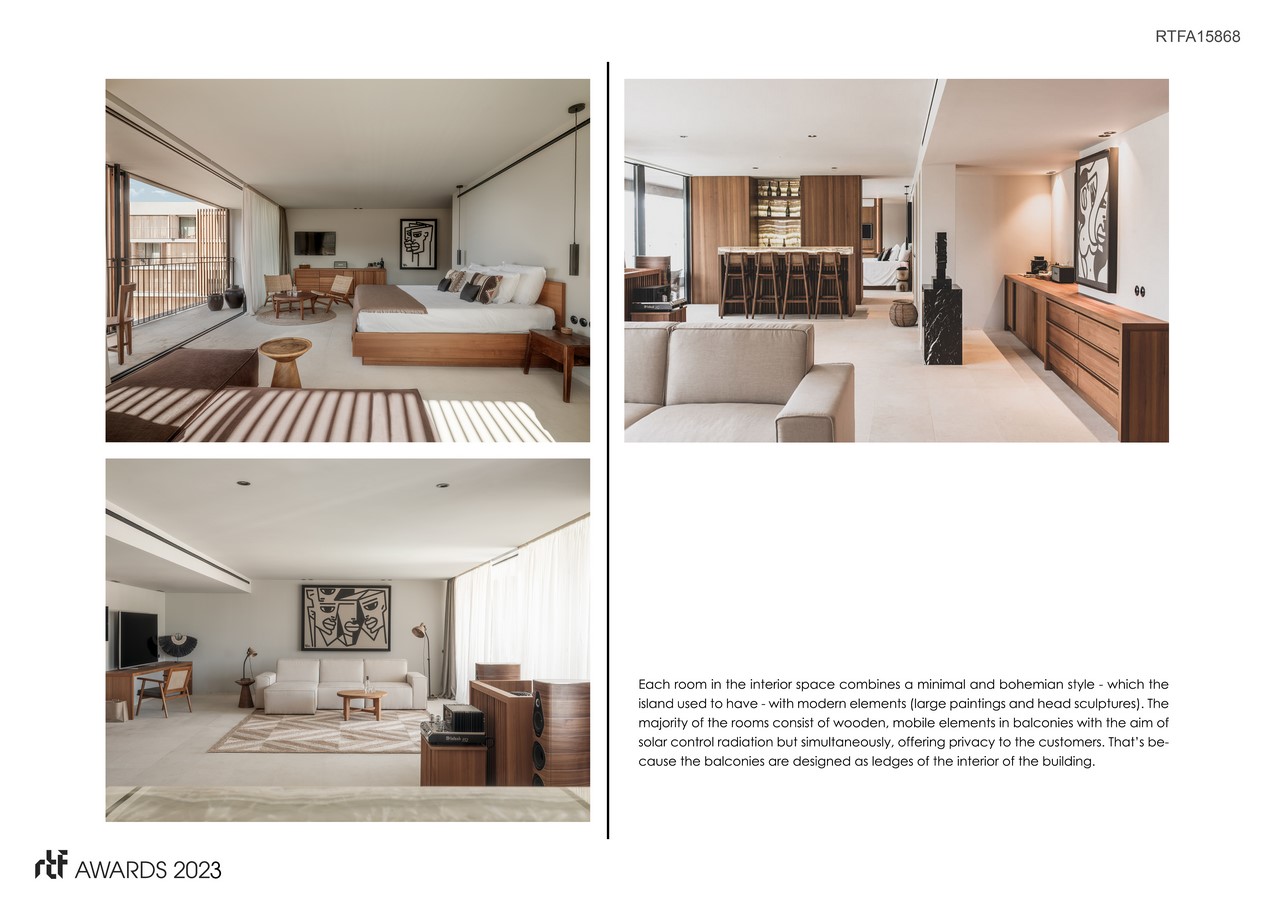 Each room in the interior space combines a minimal and bohemian style – which the island used to have – with modern elements (large paintings and head sculptures). The majority of the rooms consist of wooden, mobile elements in balconies with the aim of solar control radiation but simultaneously, offering privacy to the customers. That’s because the balconies are designed as ledges of the interior of the building.