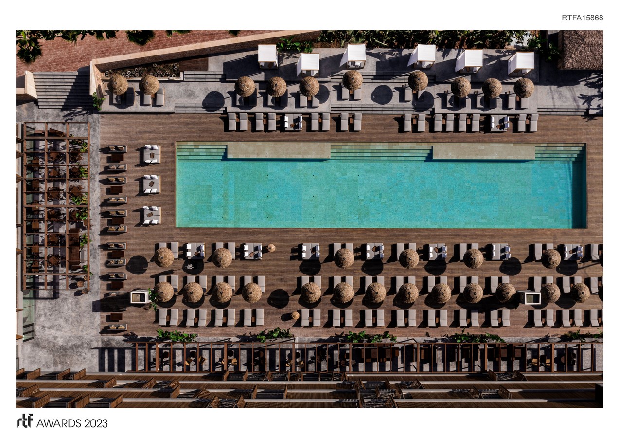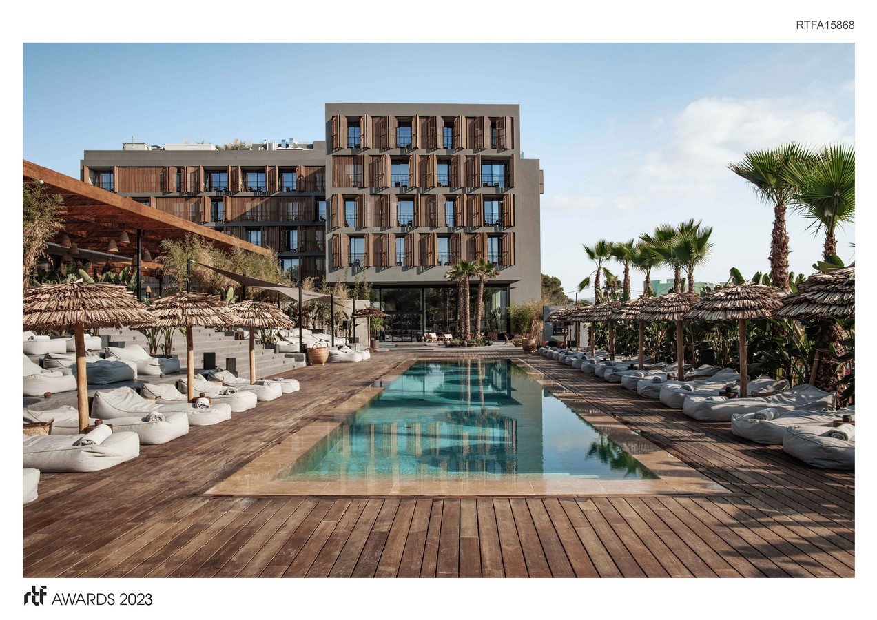 The building is a lifestyle luxury hotel which is located on the Cala Gració and surrounded by lush hills. The architects were inspired by the Japanese philosophy of wabi-sabi and have taken inspiration to reflect a focus on earthy tones and natural materials. The hotel comprises 184 guestrooms and suites, a 140m2 signature suite, a standalone four-bedroom villa with a private pool, ocean-view penthouses, two hotel pools (and a further semi-private pool serving the six swim-up rooms), two restaurants, and an intimate spa. The hotel unit was created in two phases, plot 1 and plot 2.